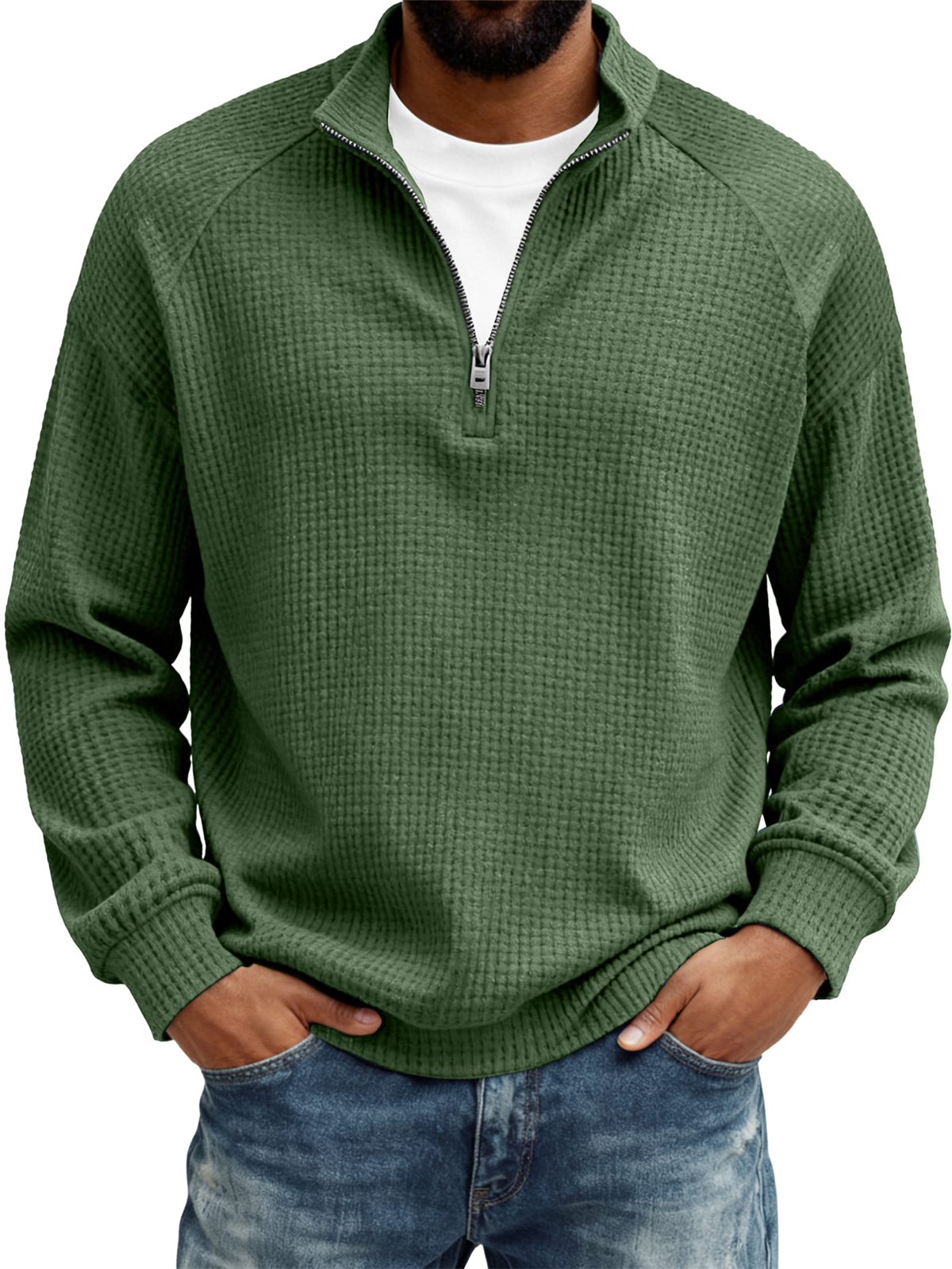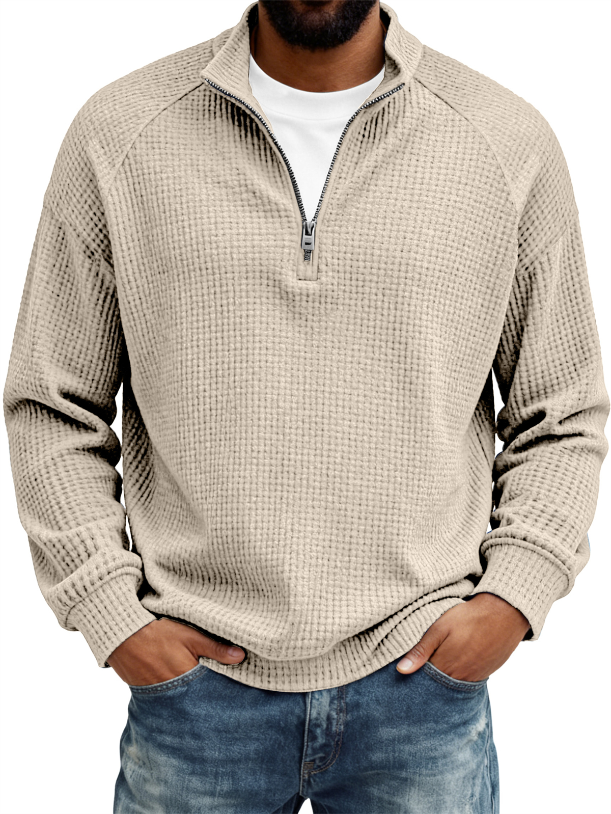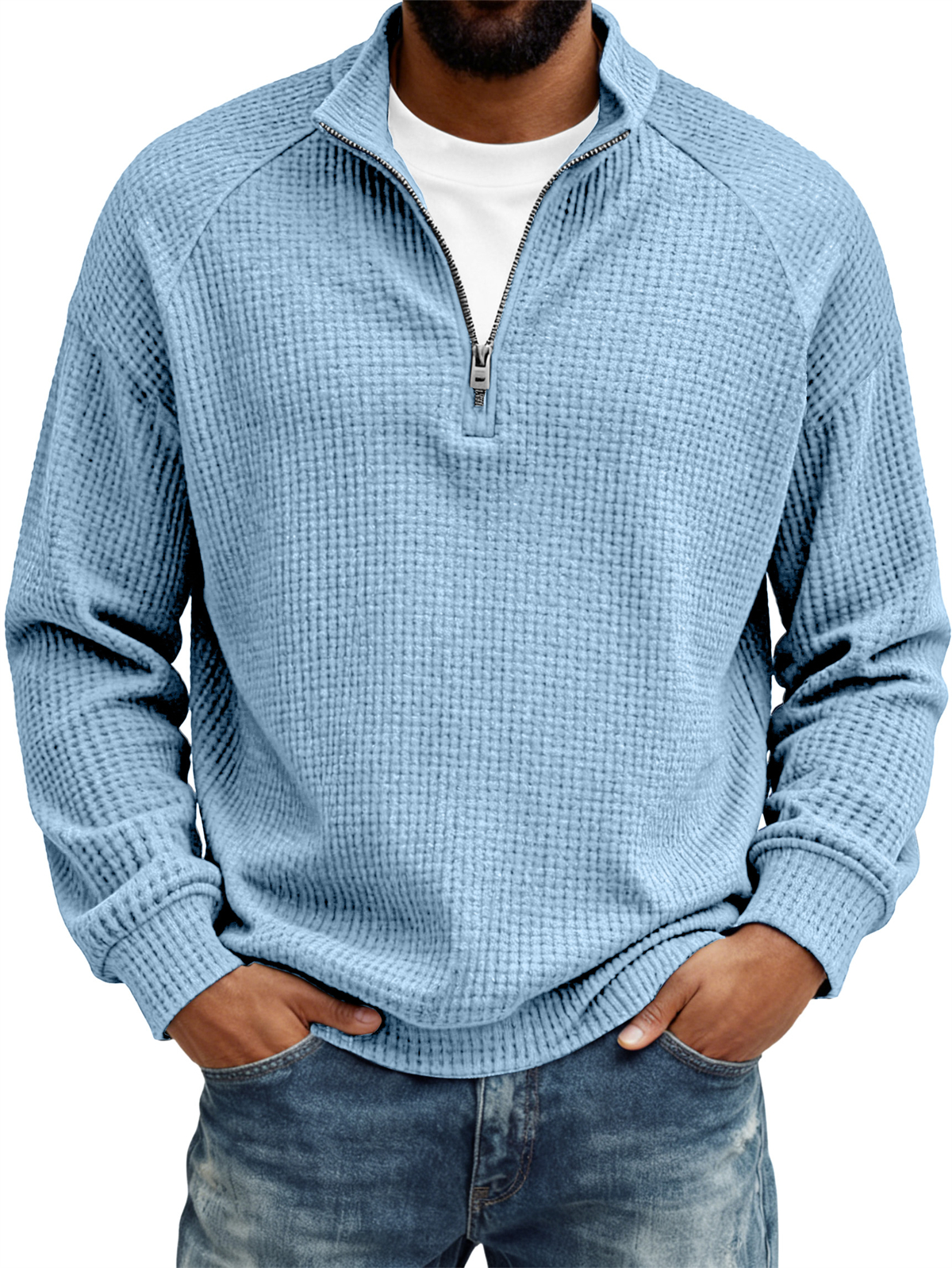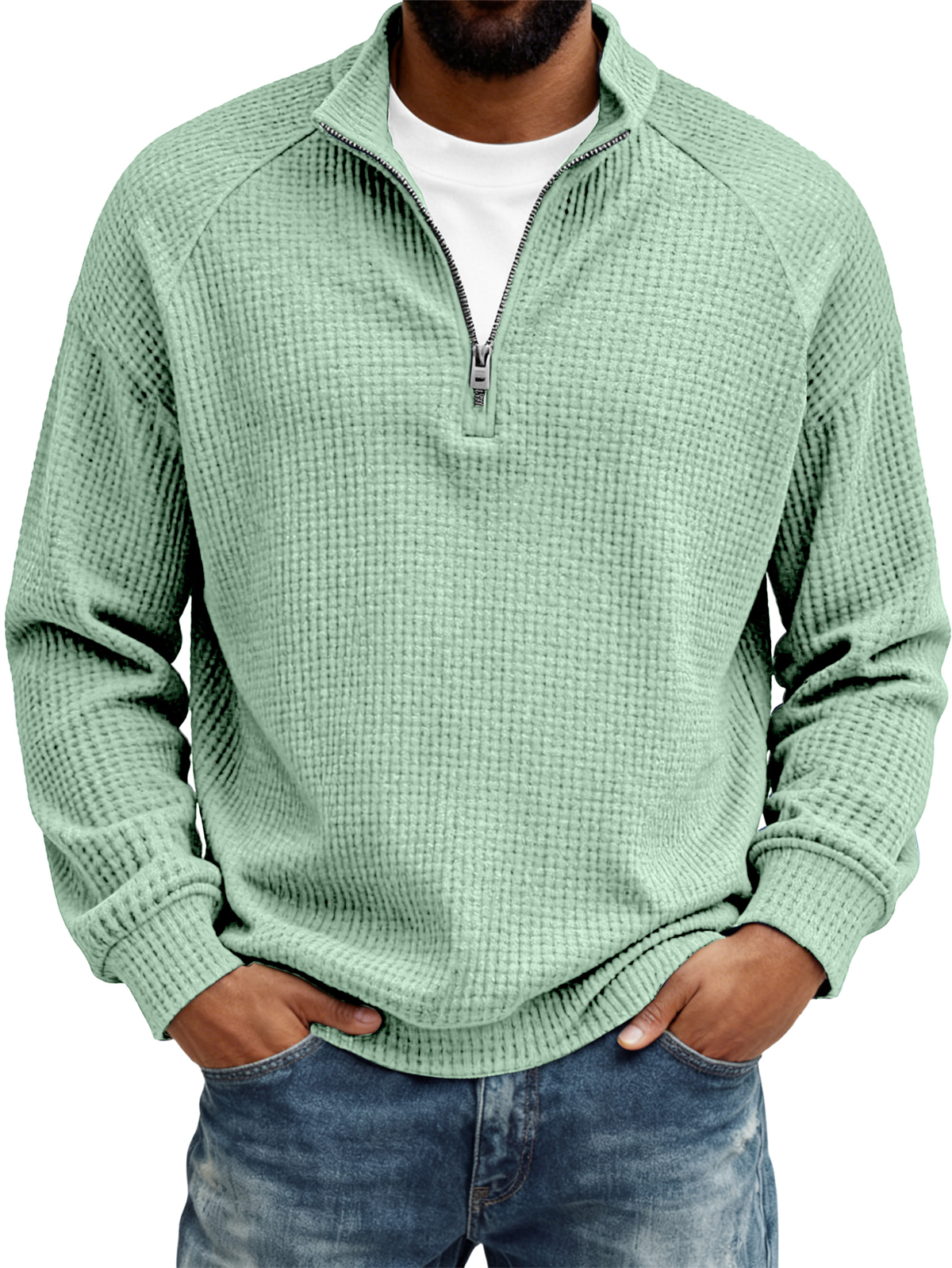 Men's Retro Casual Waffle Fabric Raglan Sleeve Quarter-Zip Long-Sleeve T-Shirt