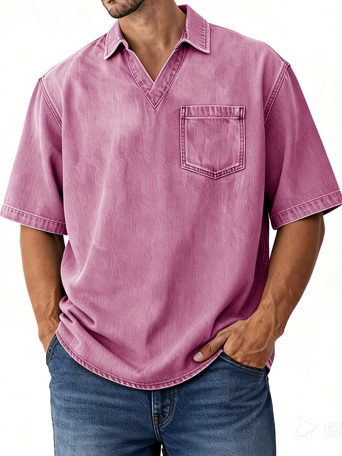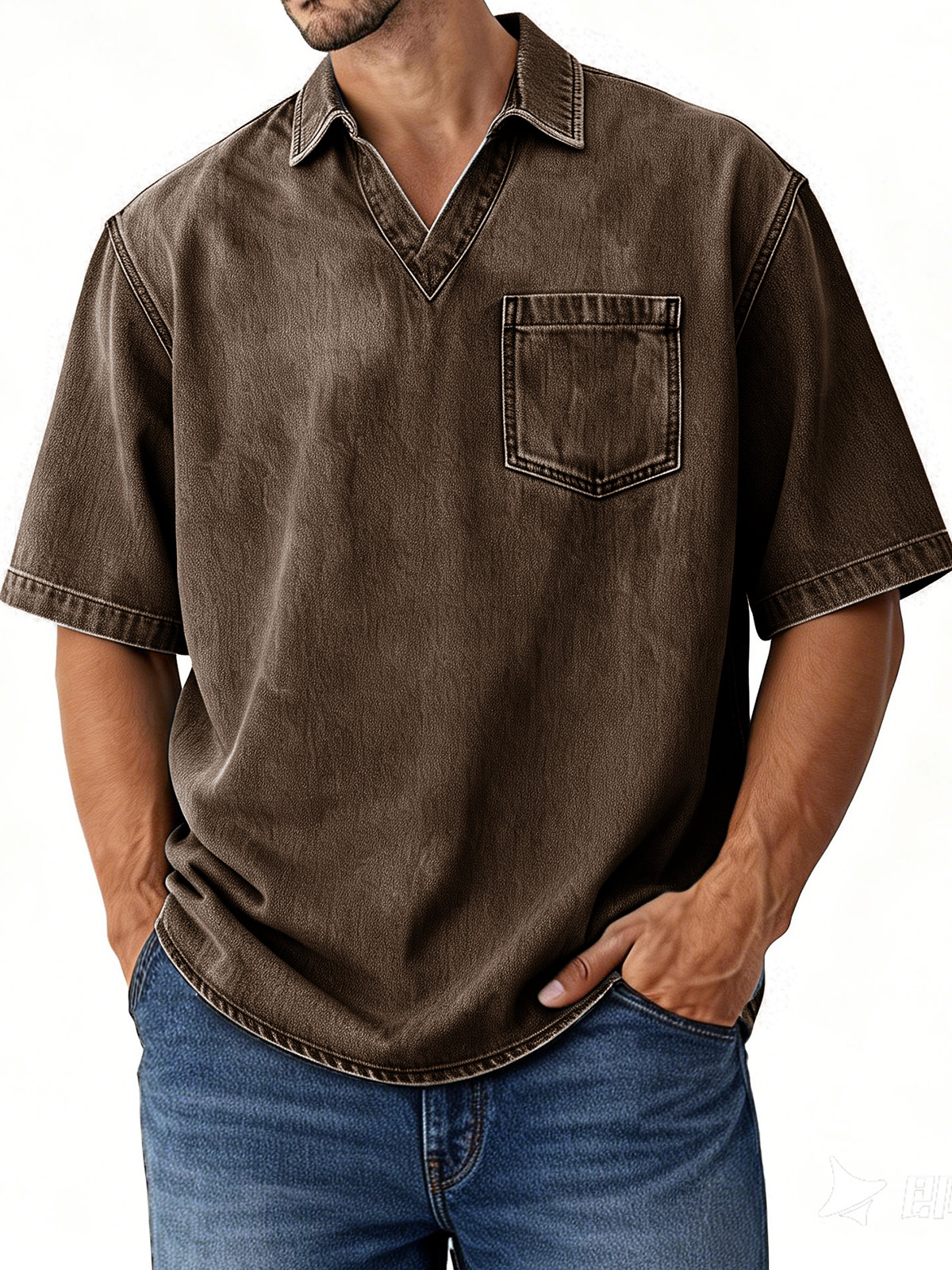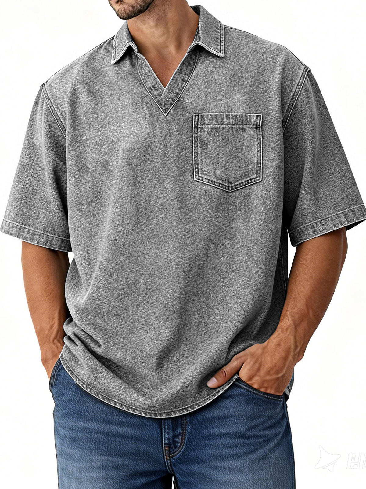 Men's Retro Distressed V-Neck Pocket Short-Sleeve Polo Shirt