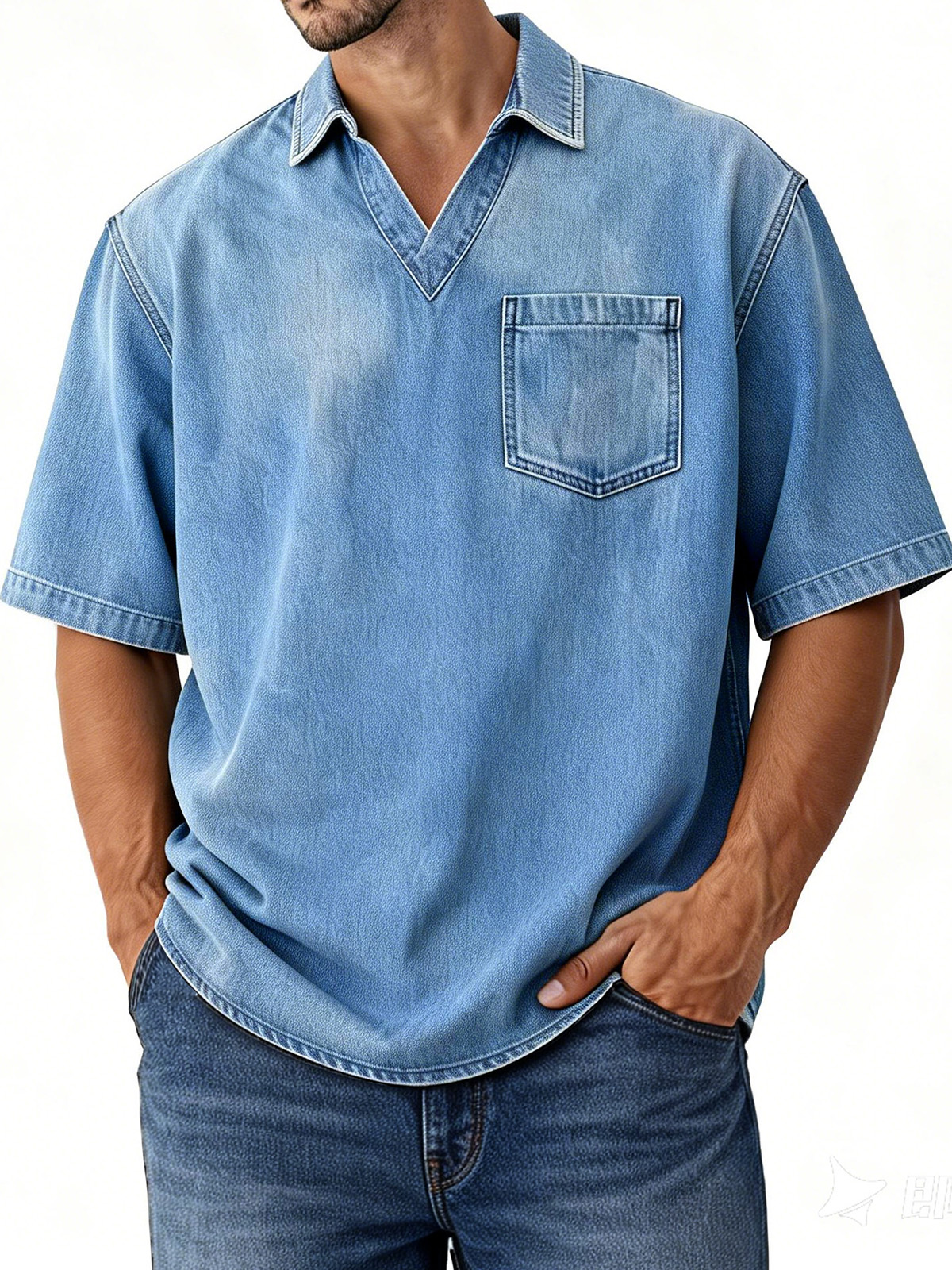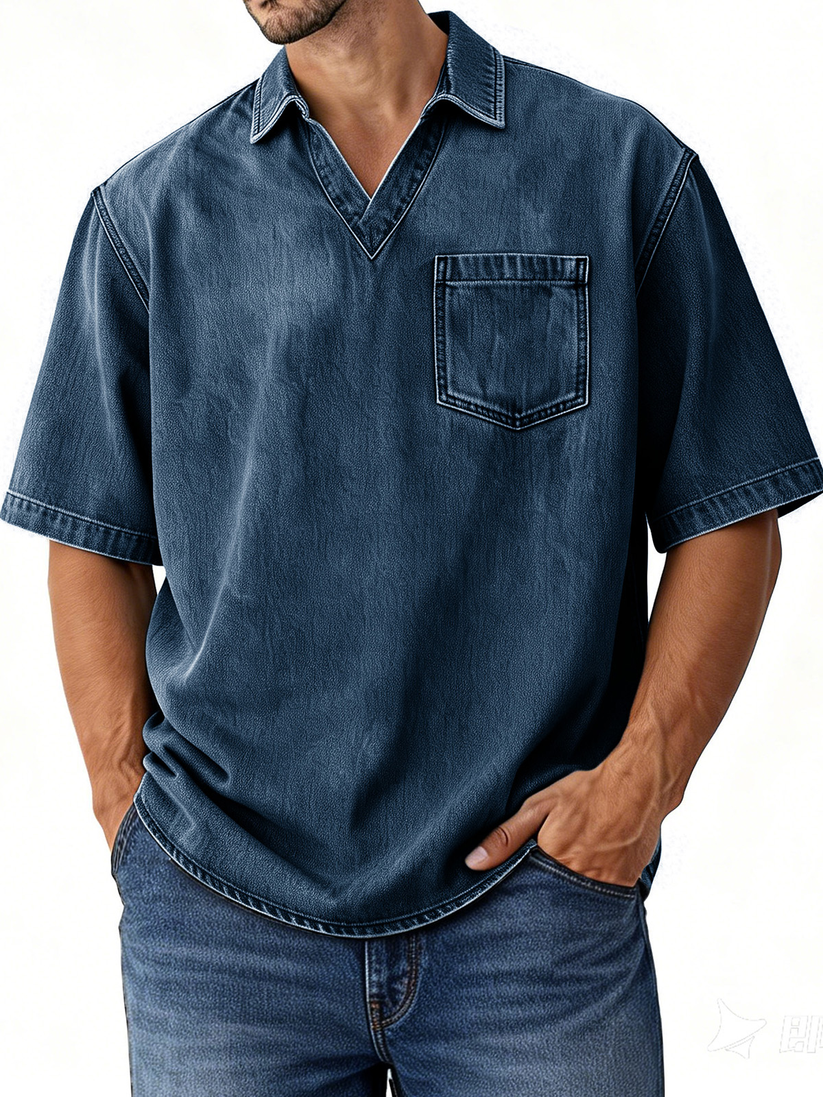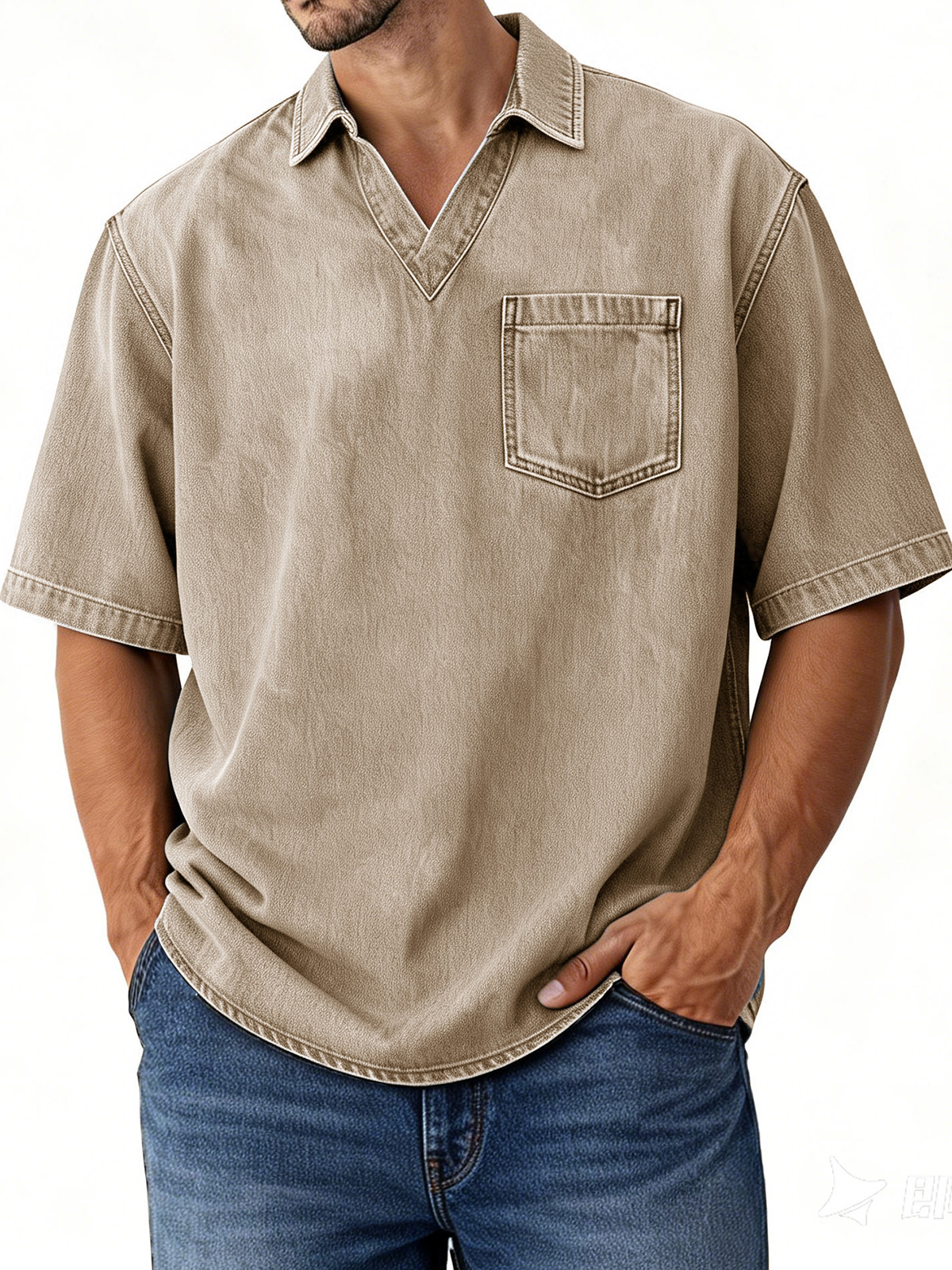 Men's Retro Distressed V-Neck Pocket Short-Sleeve Polo Shirt