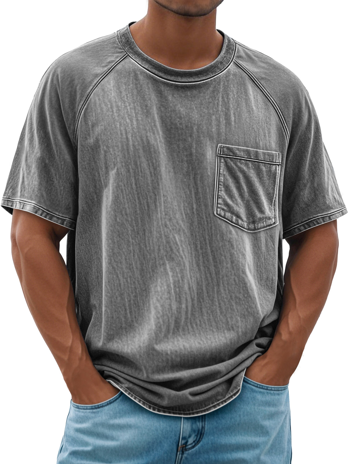 Men's Retro Round Neck Raglan Pocket Casual Short Sleeve T-Shirt