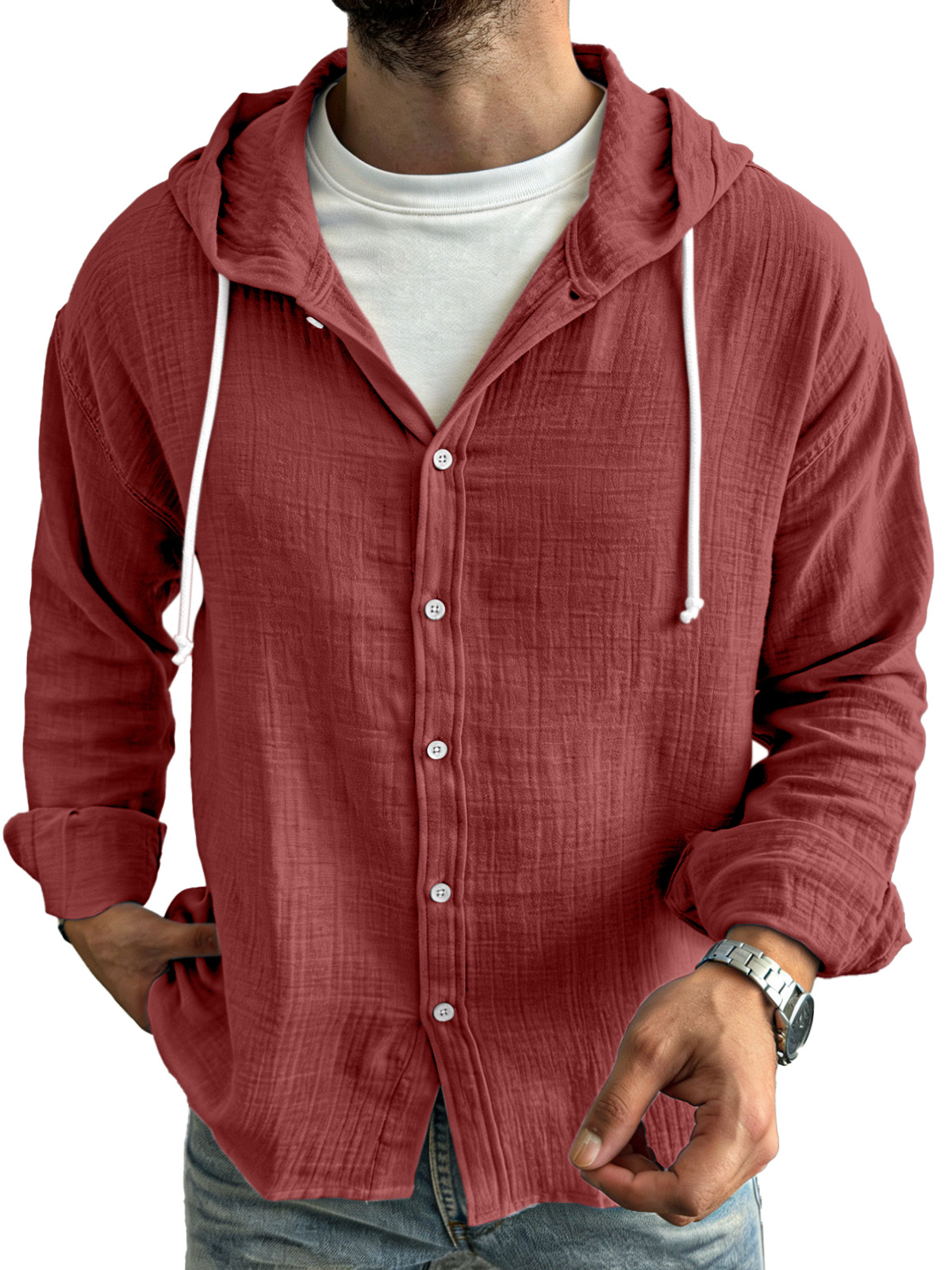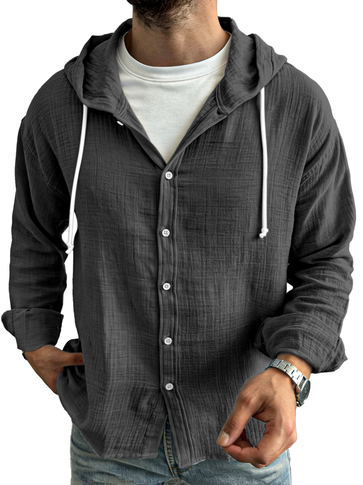 Men's simple casual comfortable loose buttoned hooded long sleeve shirt