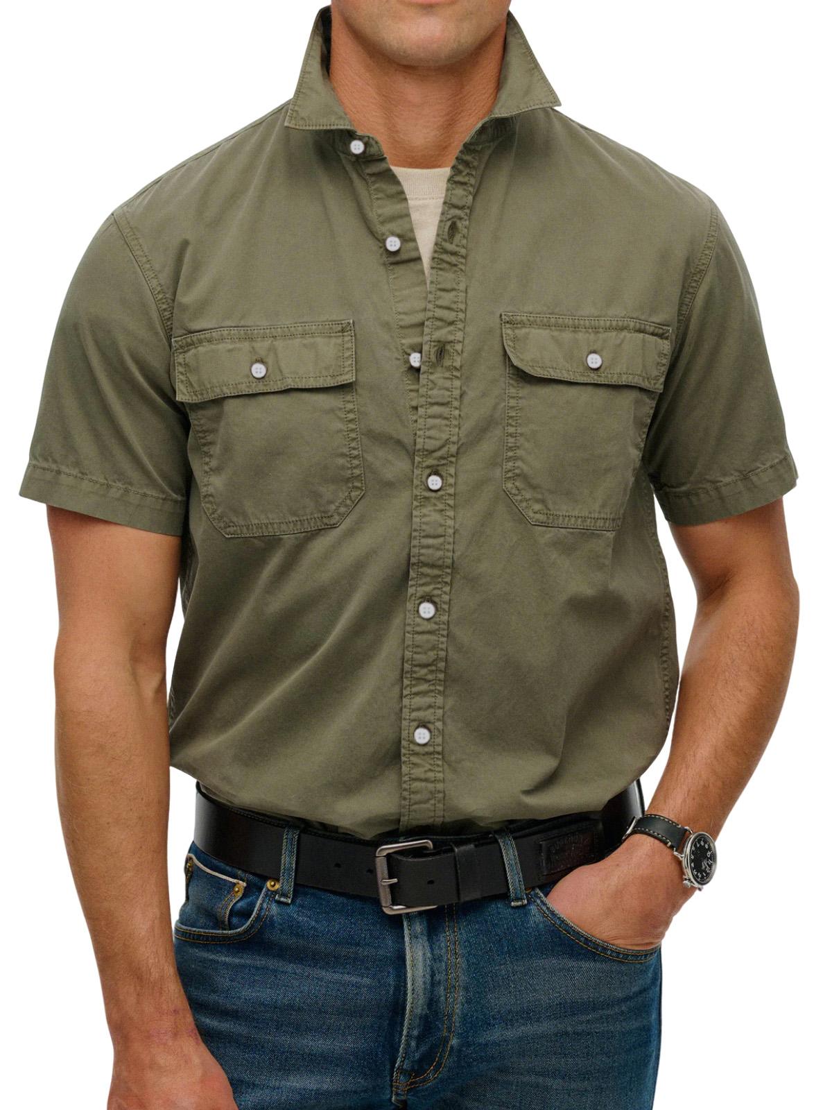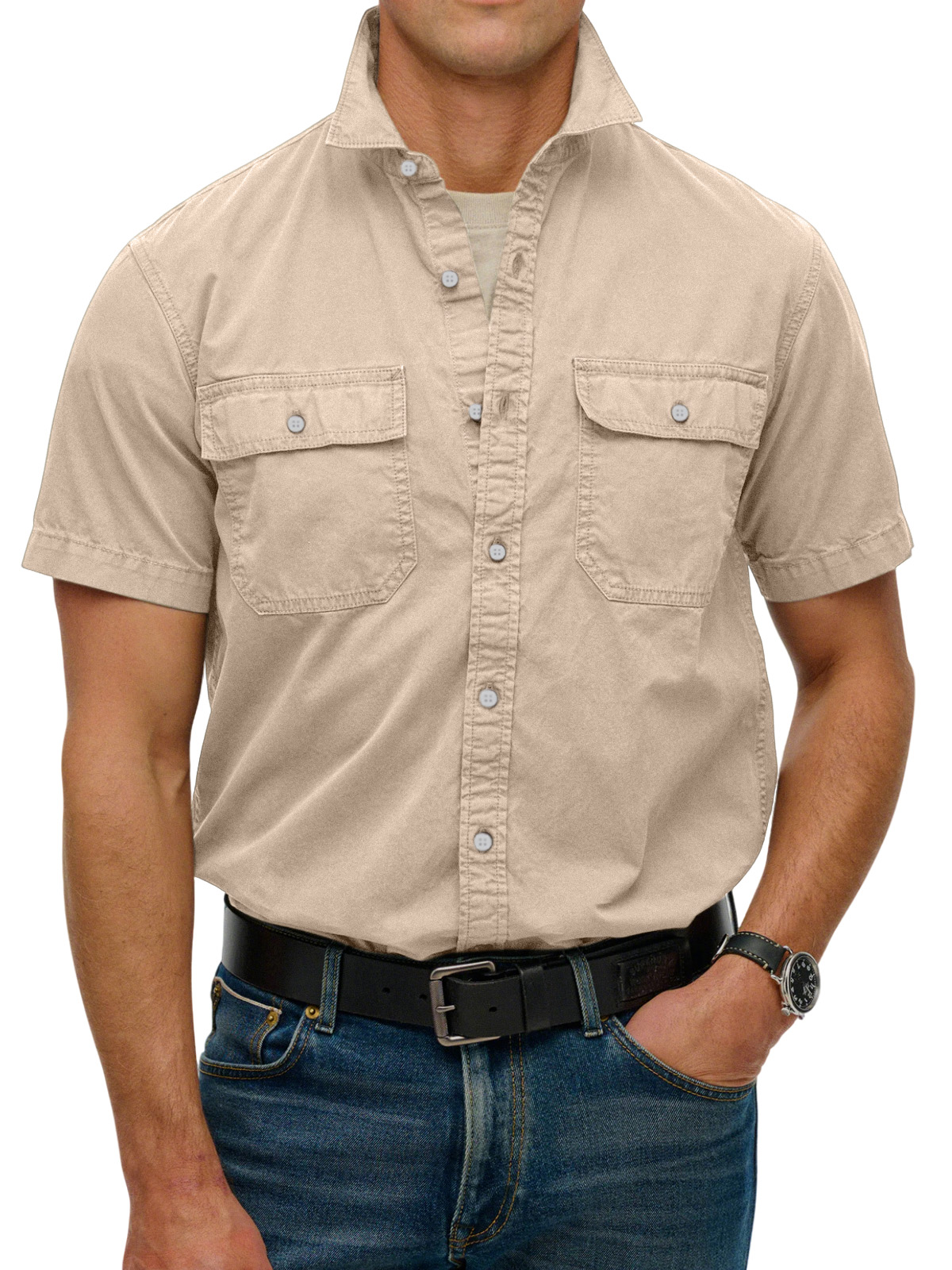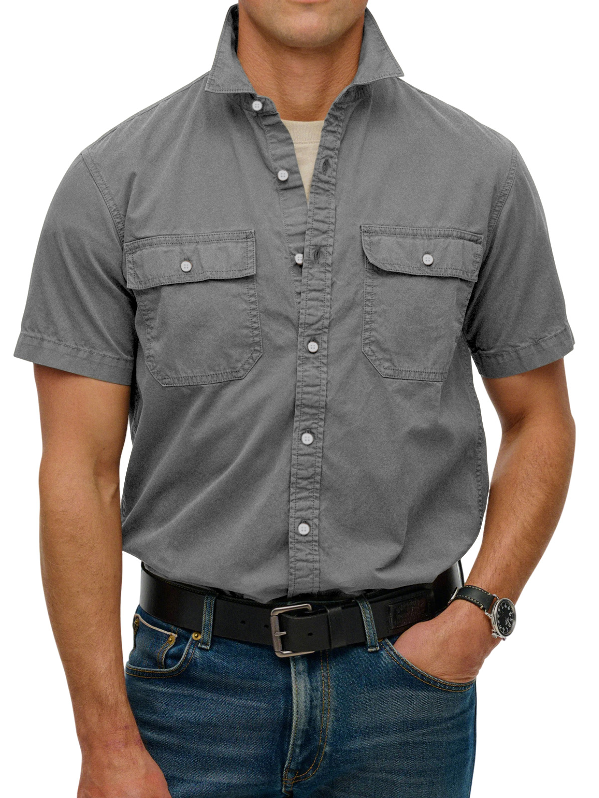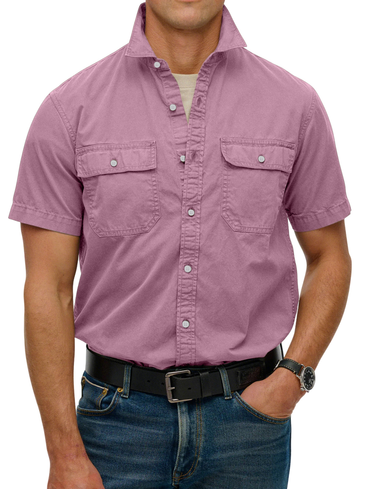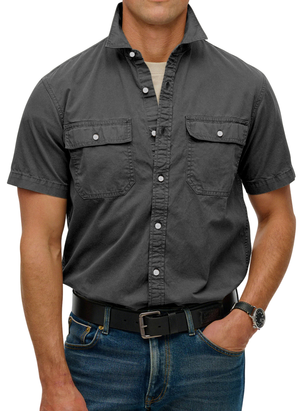 Men's simple double-pocket lapel button-down short-sleeved shirt