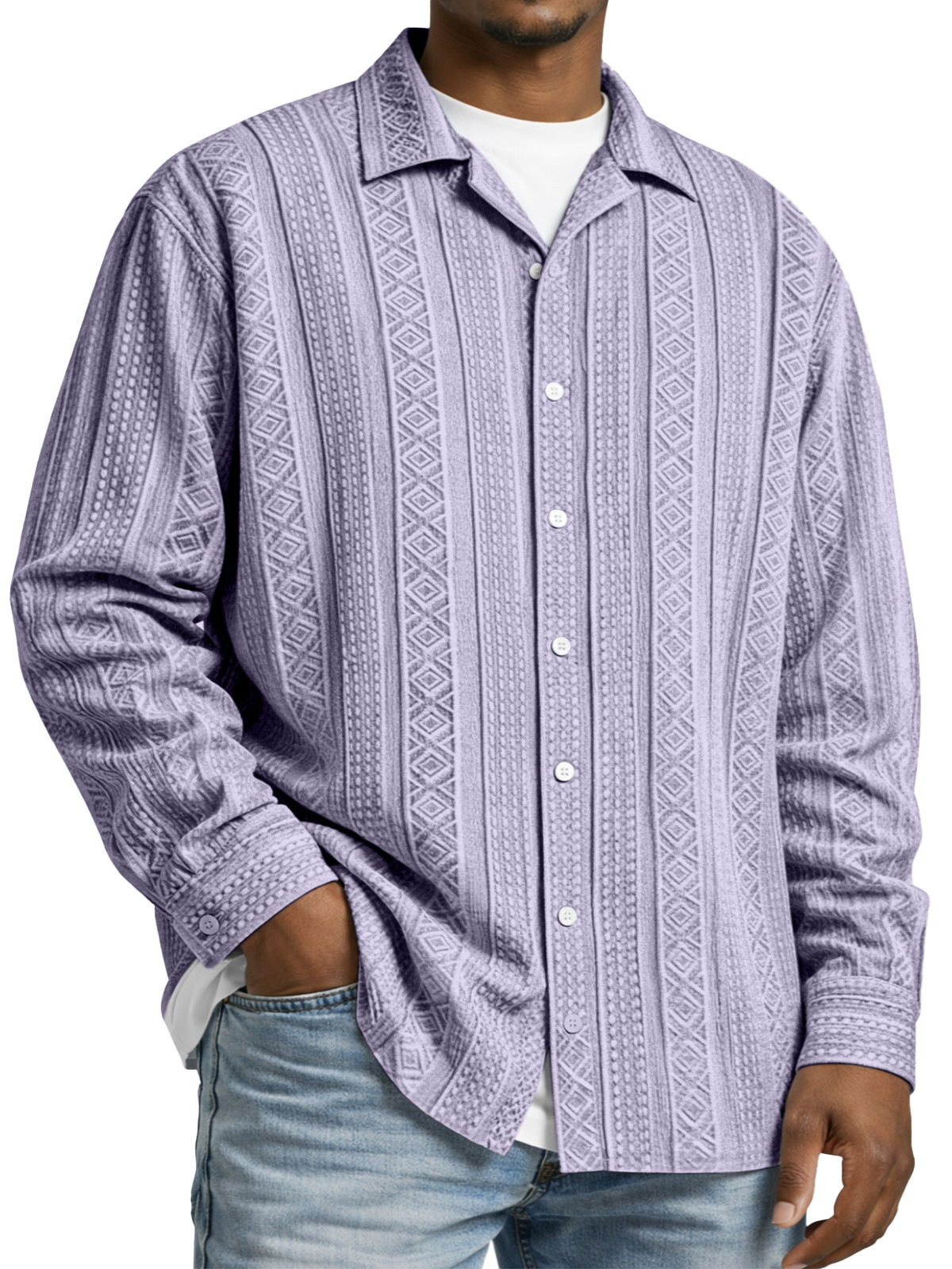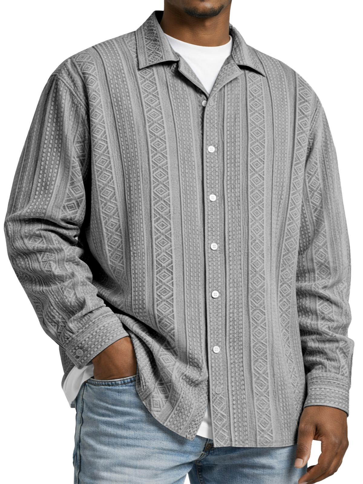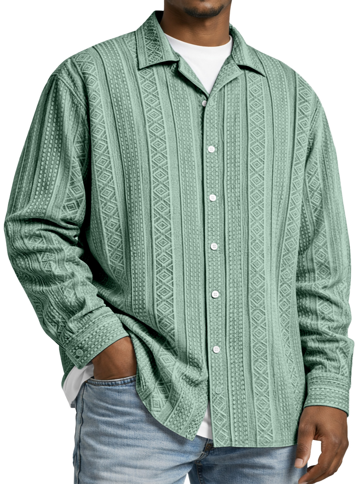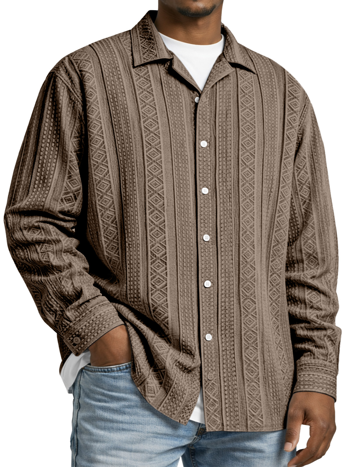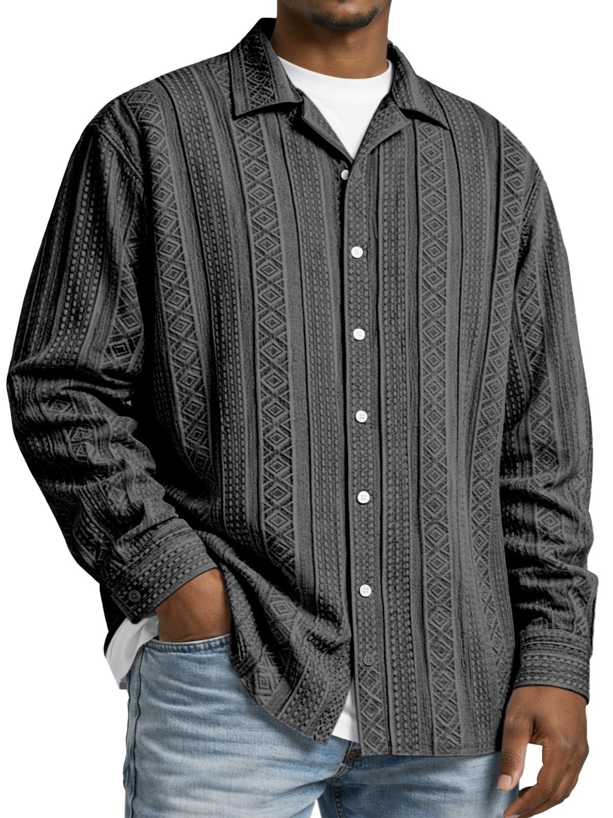 Men's Simple Solid Color Textured Long-sleeved Collared Shirt