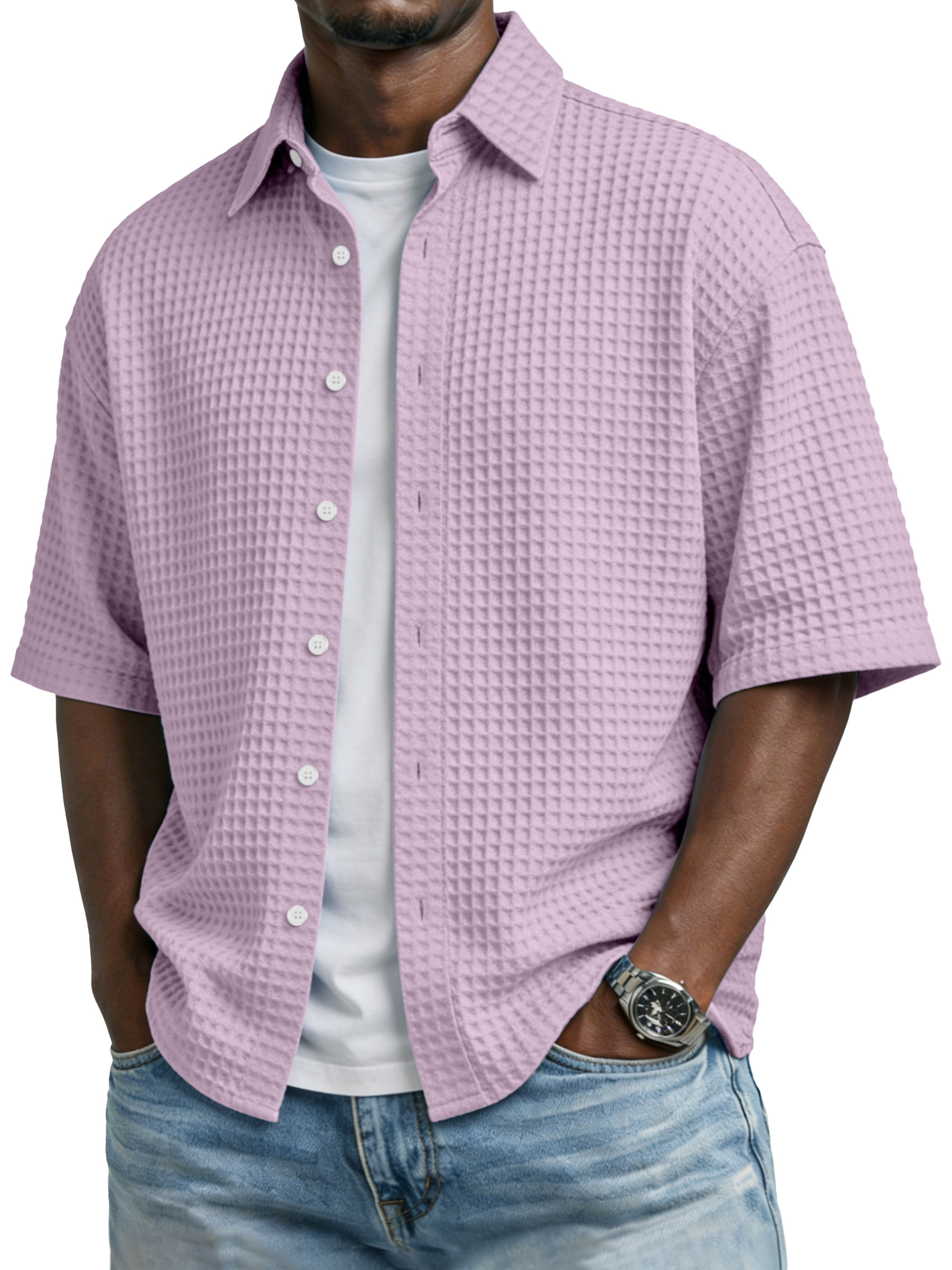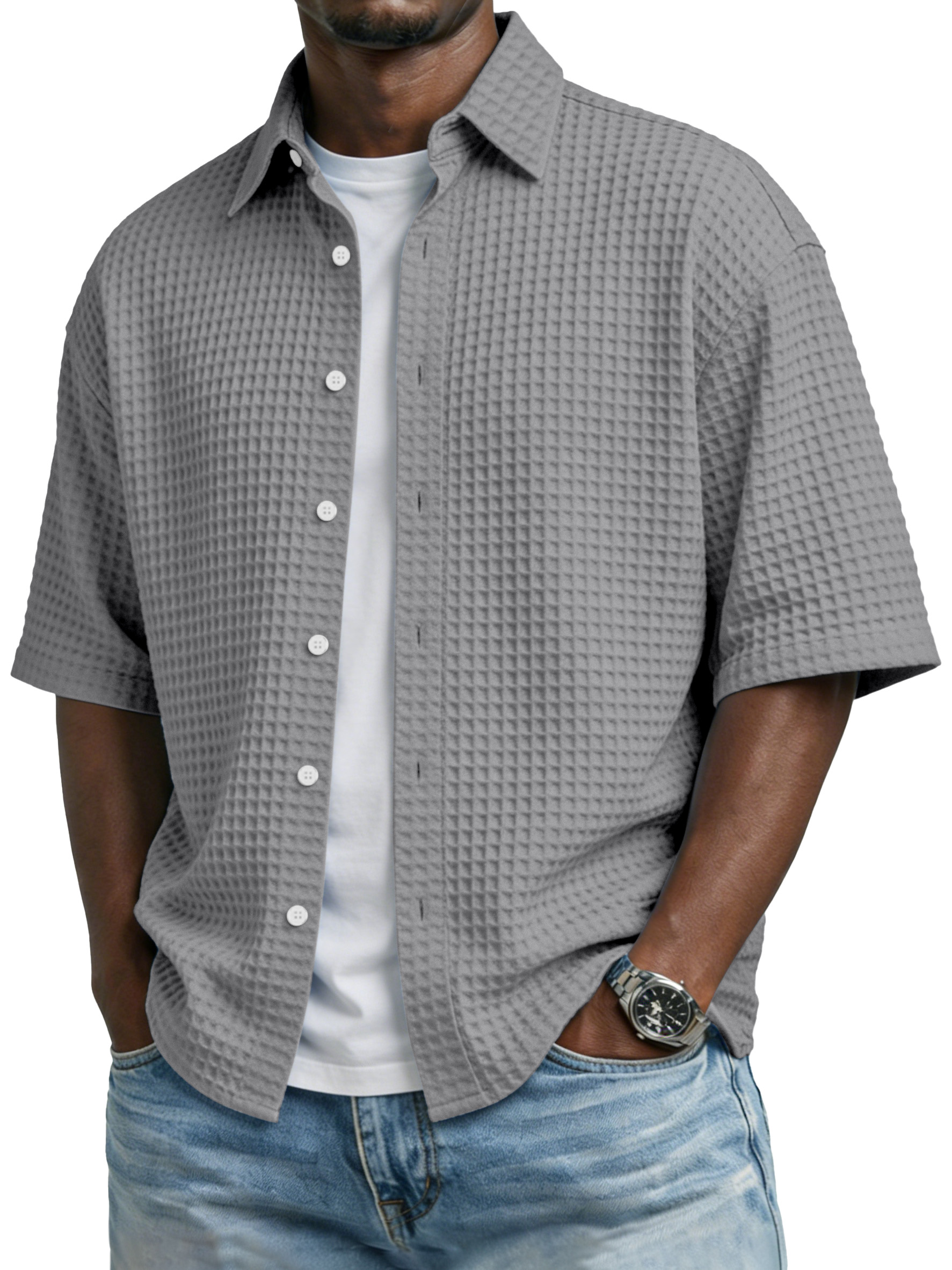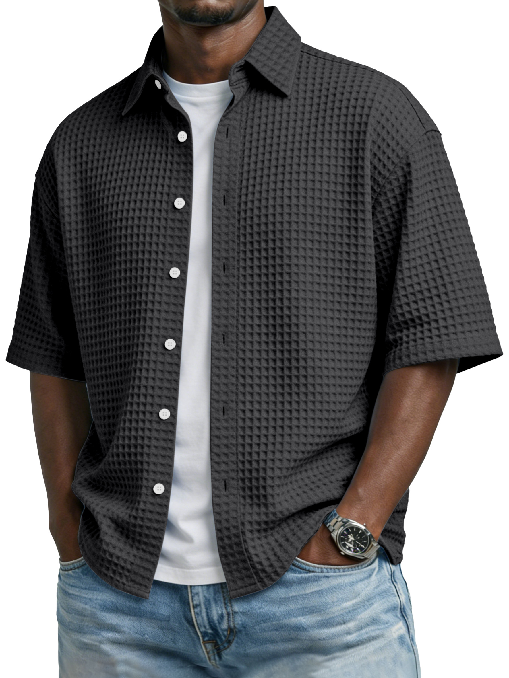 Men's Simple Solid-color Waffle-knit Lapel Casual Short-sleeved Shirt