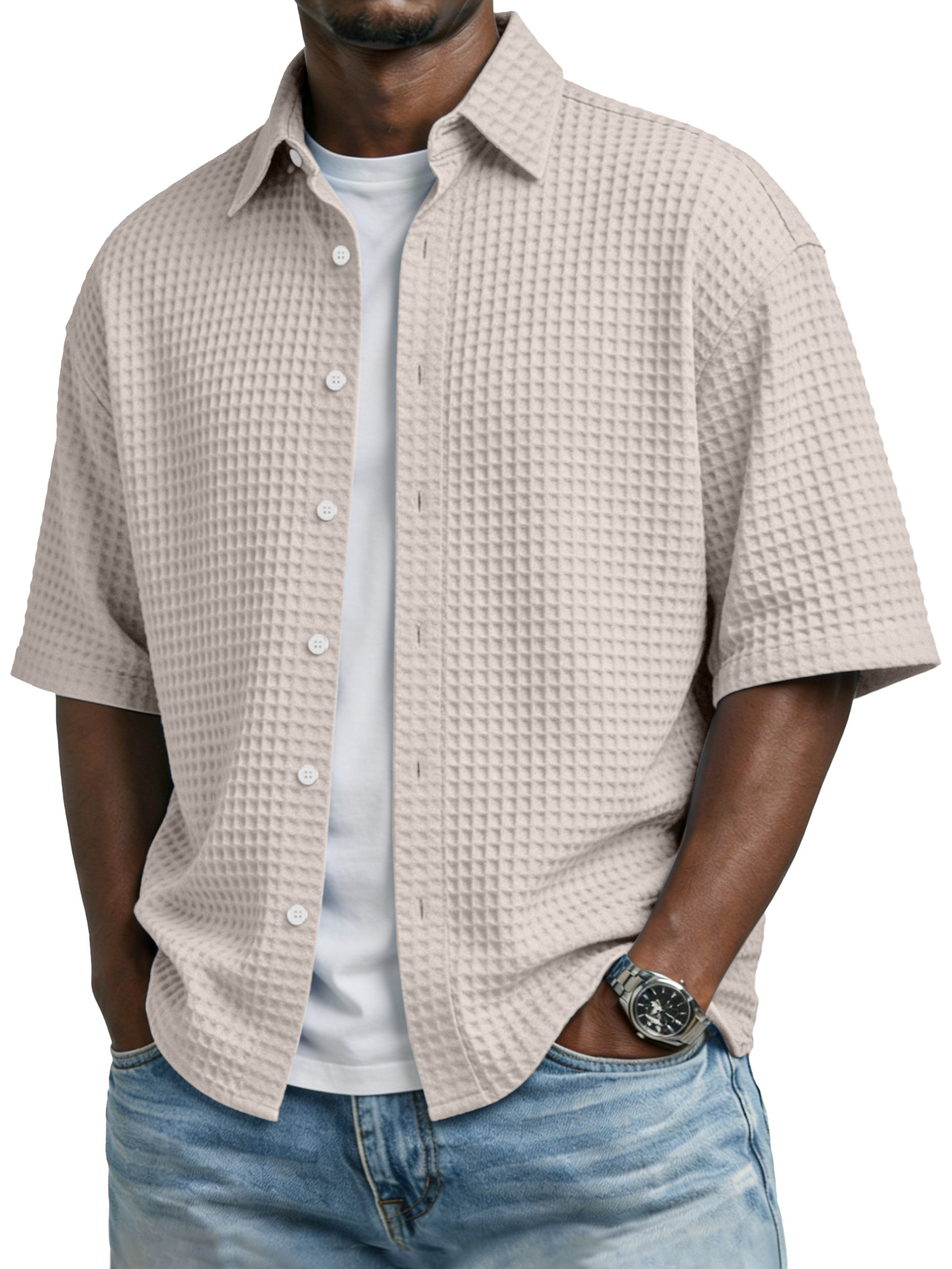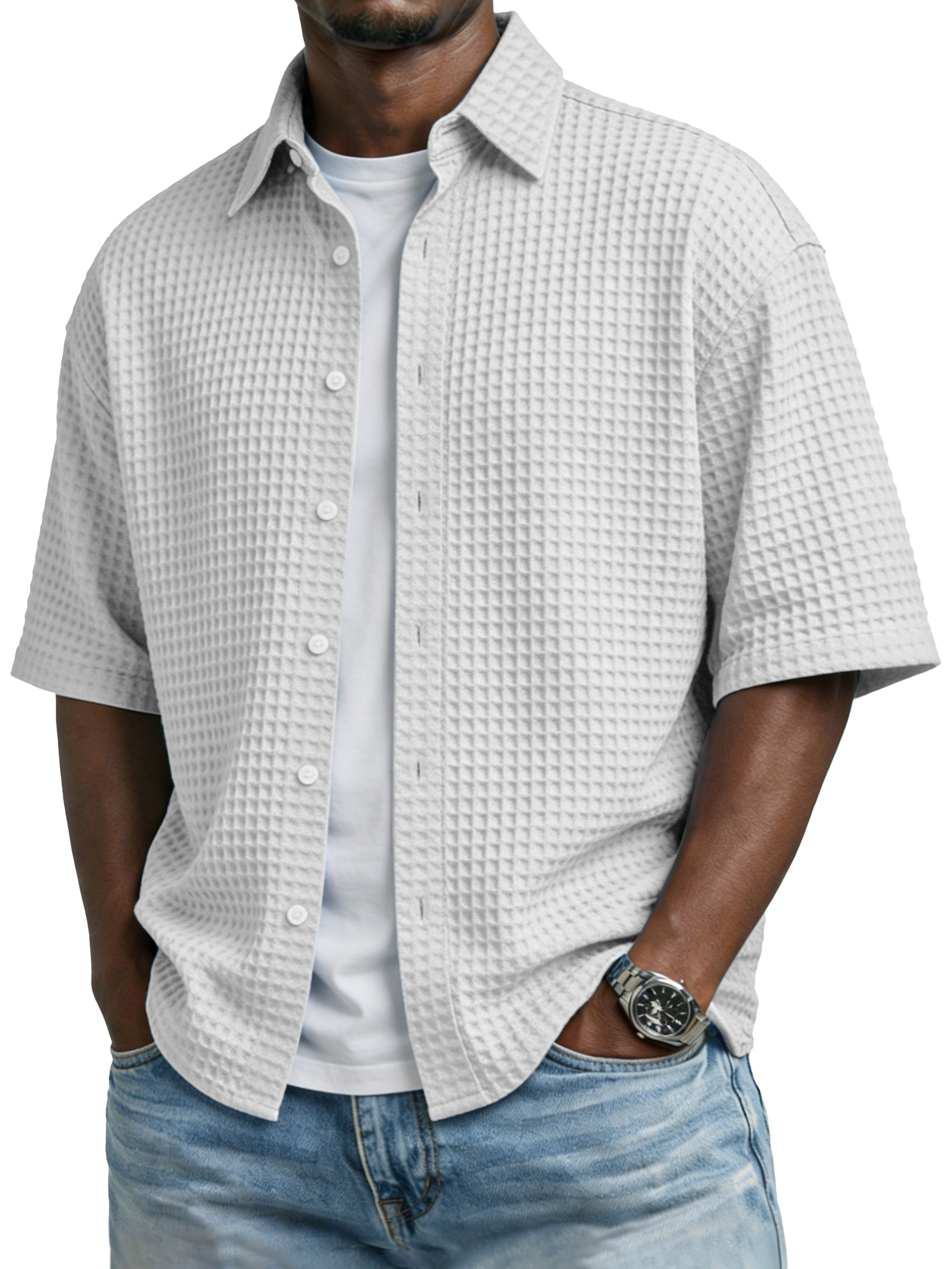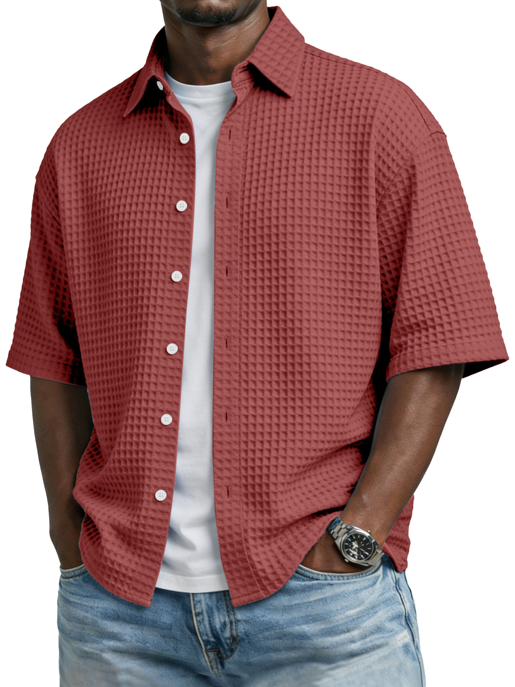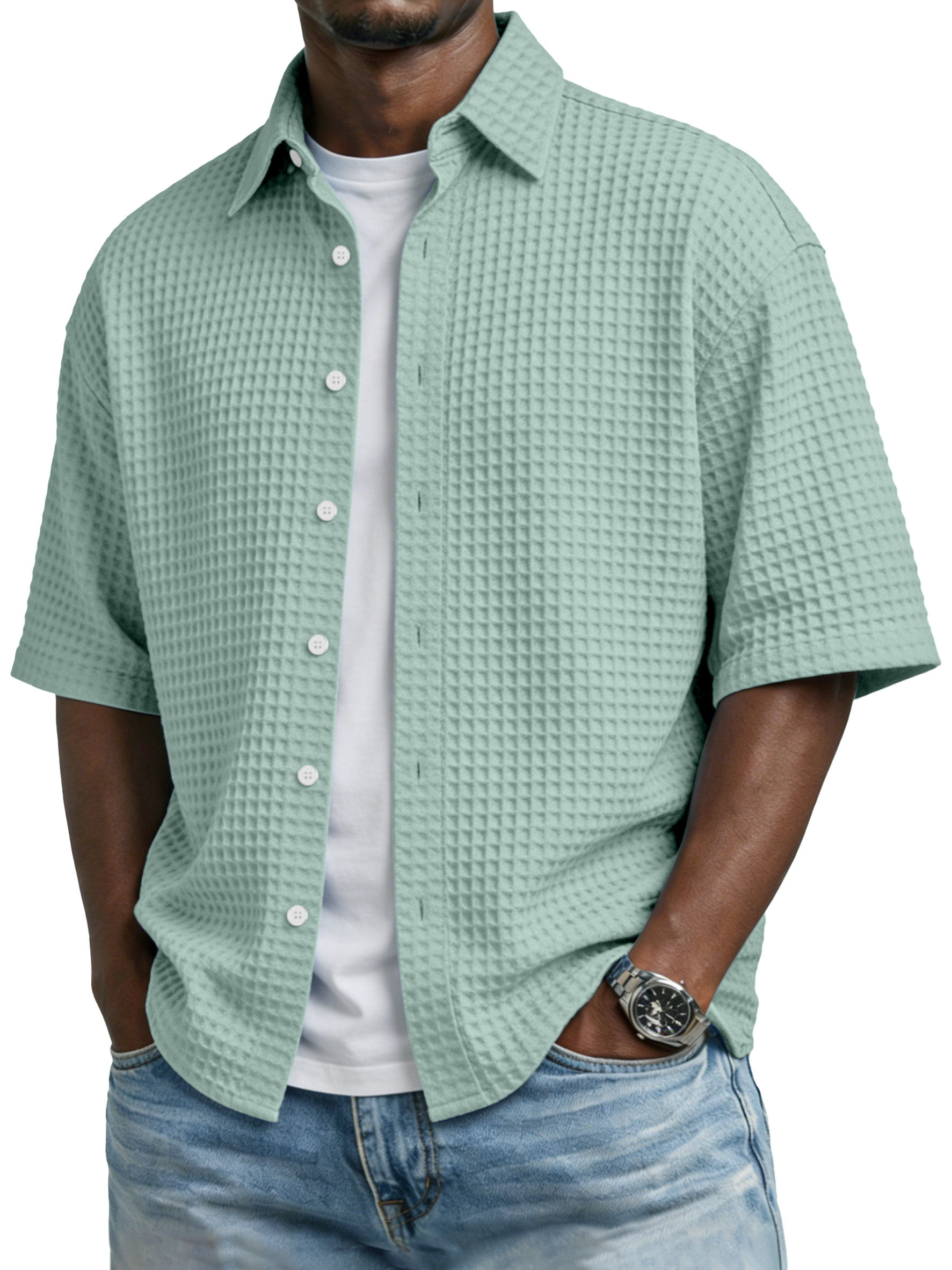 Men's Simple Solid-color Waffle-knit Lapel Casual Short-sleeved Shirt