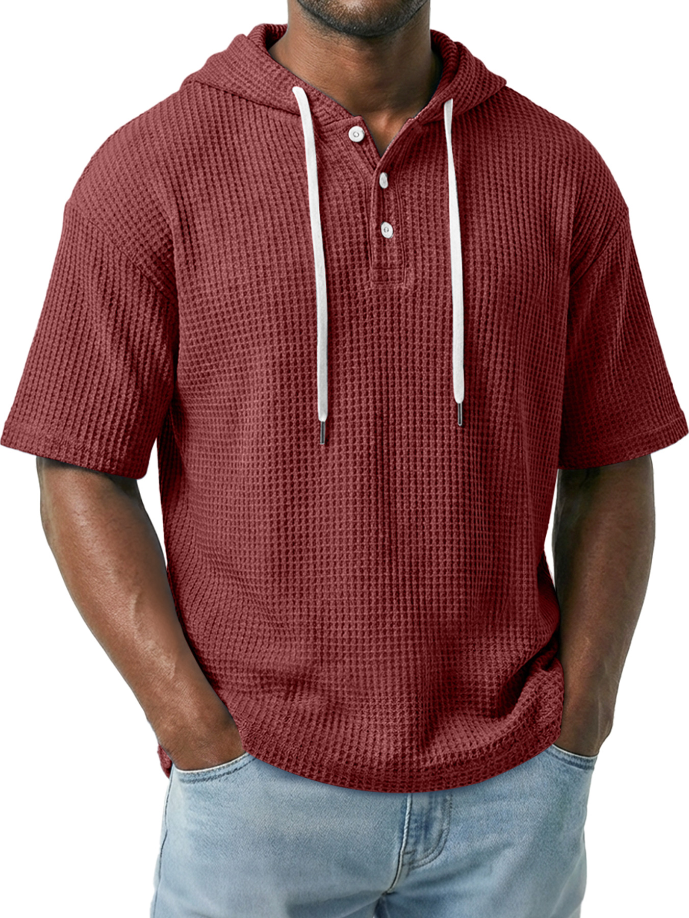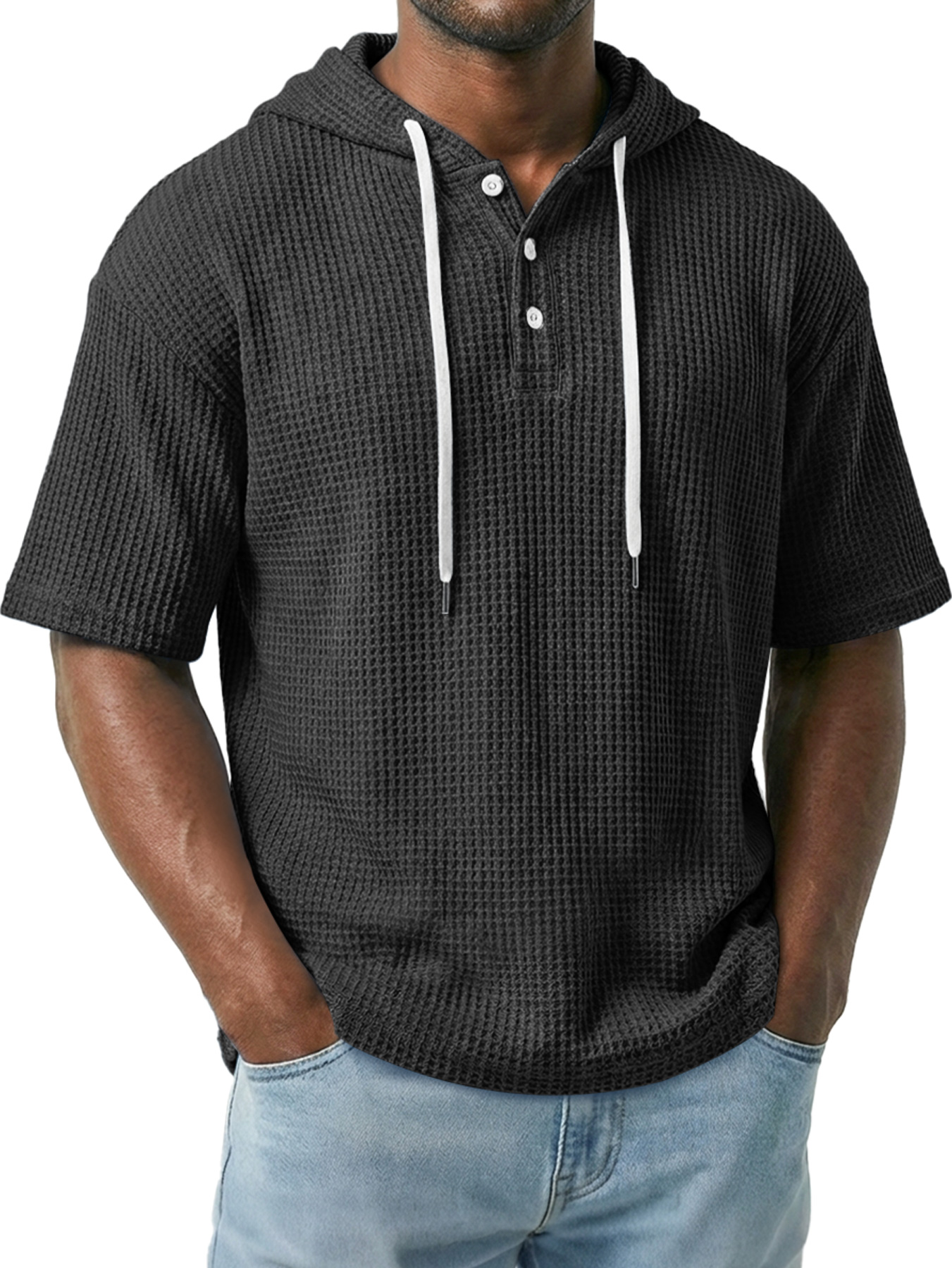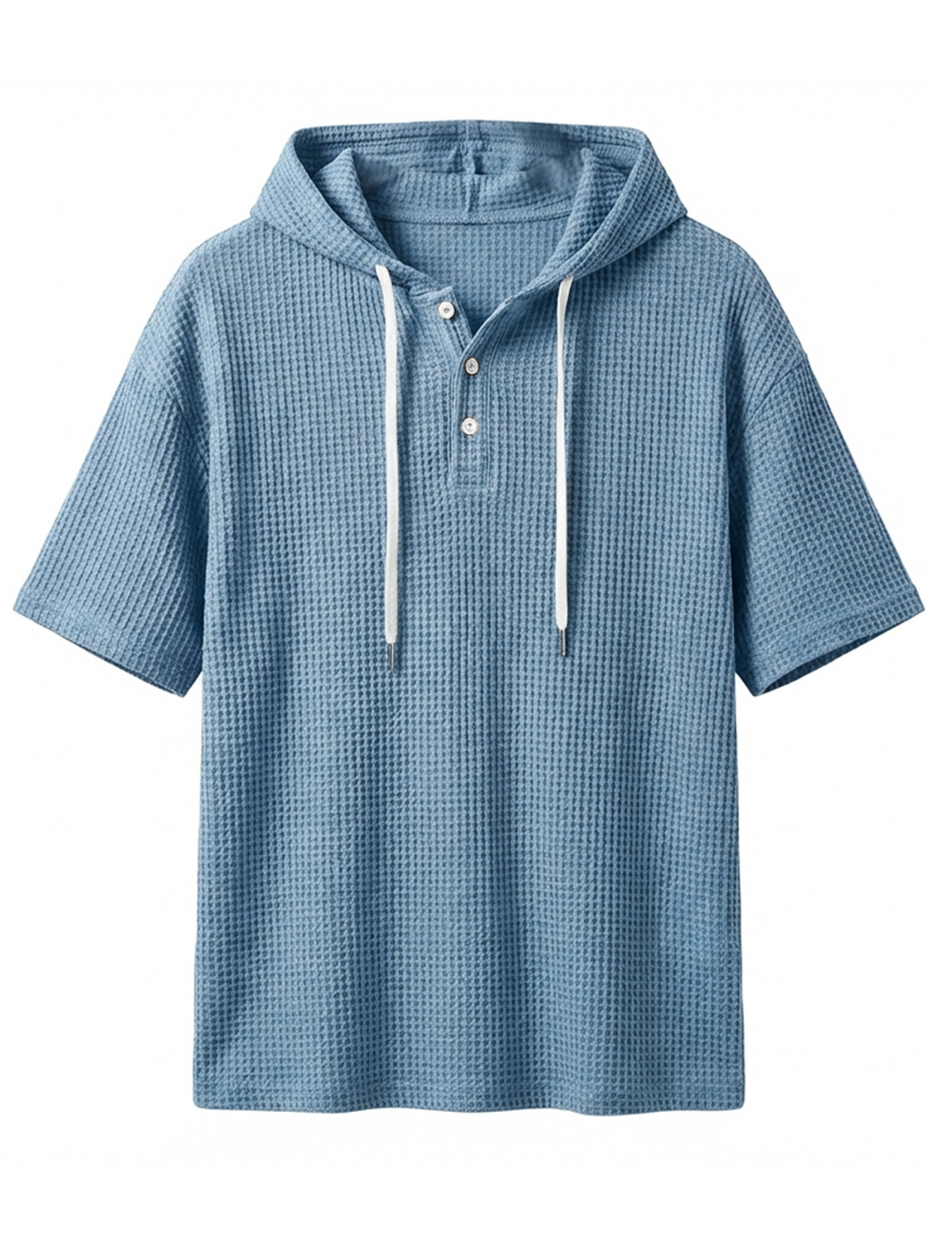 Men's Simple Waffle Knit Hooded Button-up Casual Short-sleeve Top