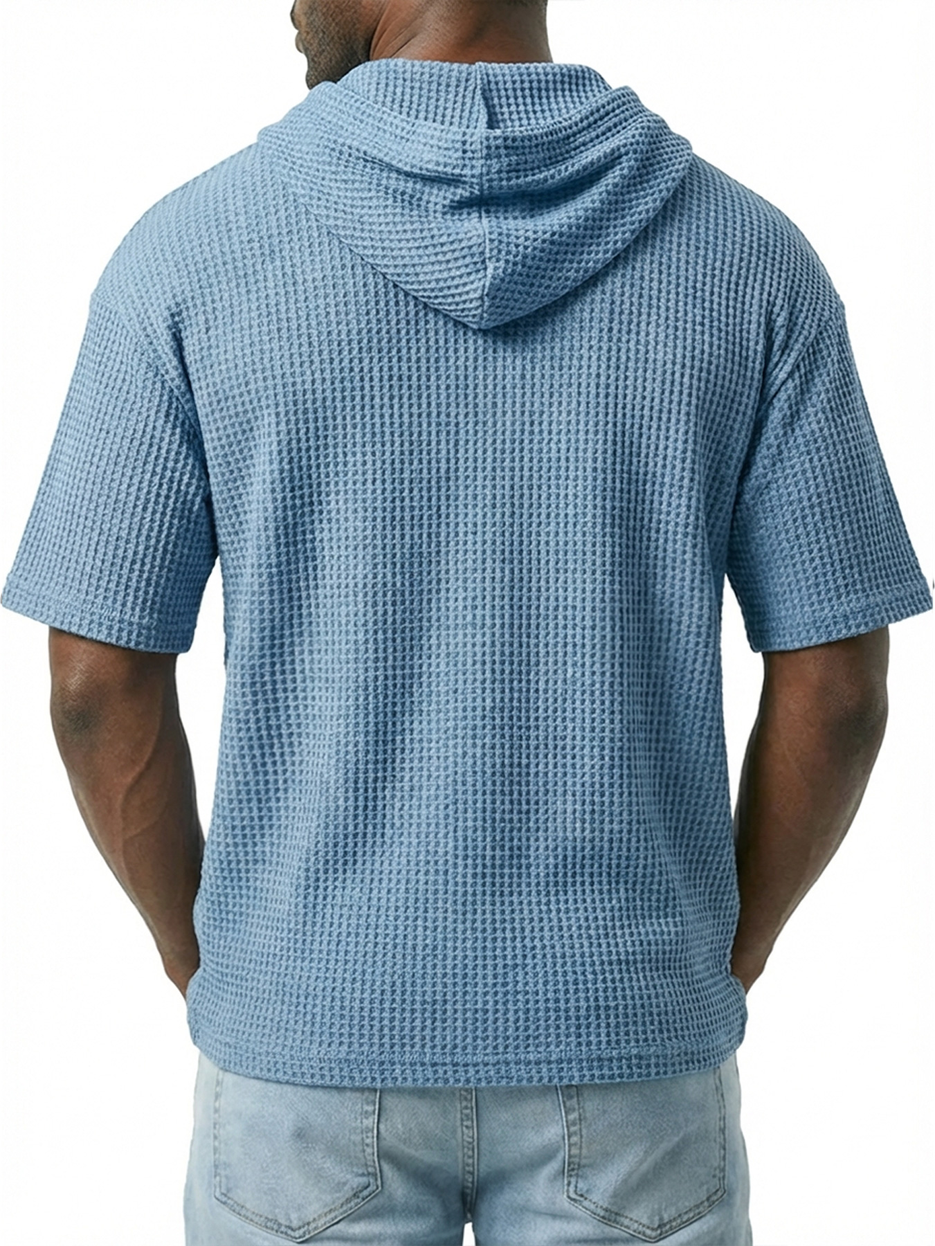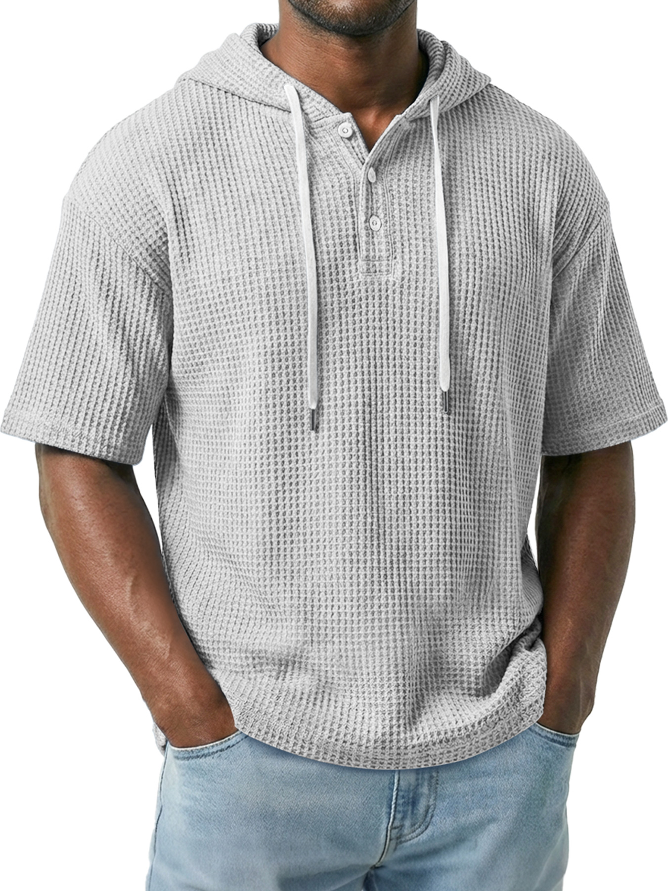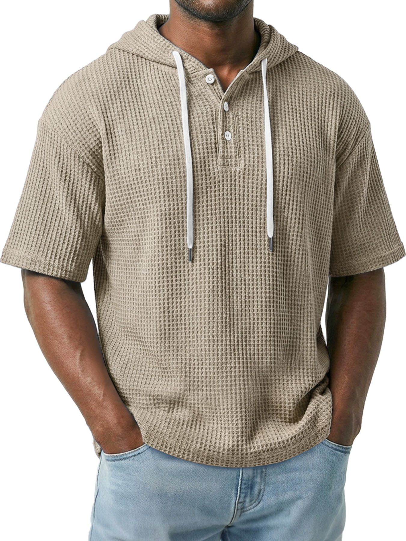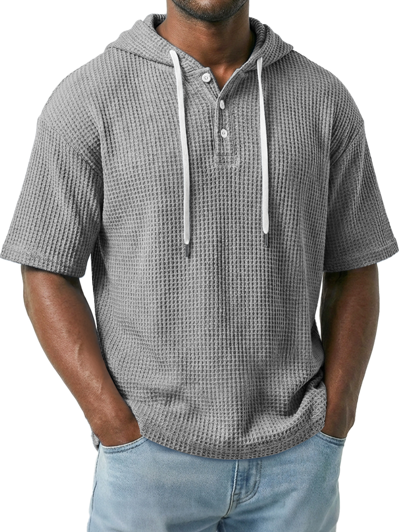 Men's Simple Waffle Knit Hooded Button-up Casual Short-sleeve Top