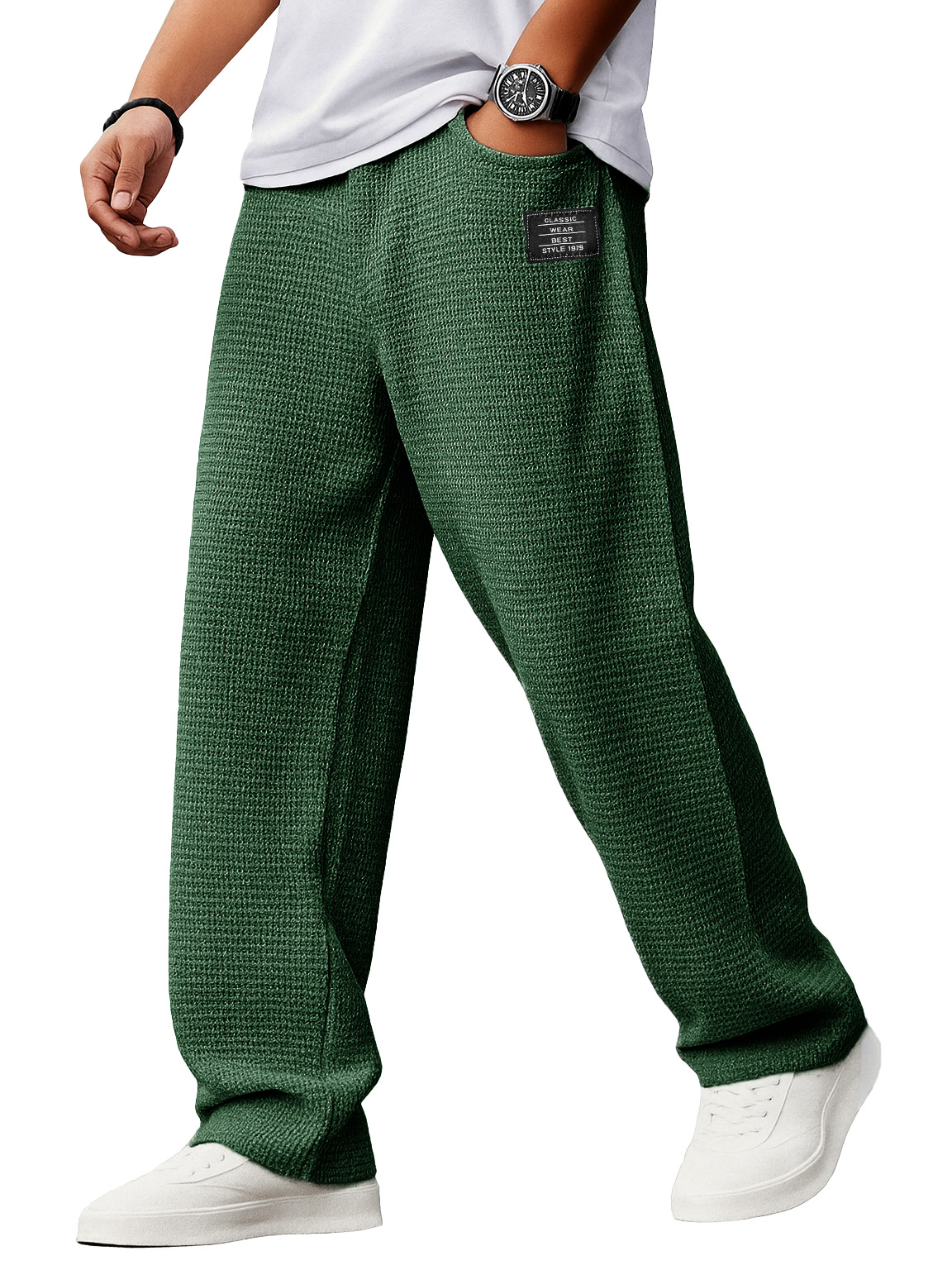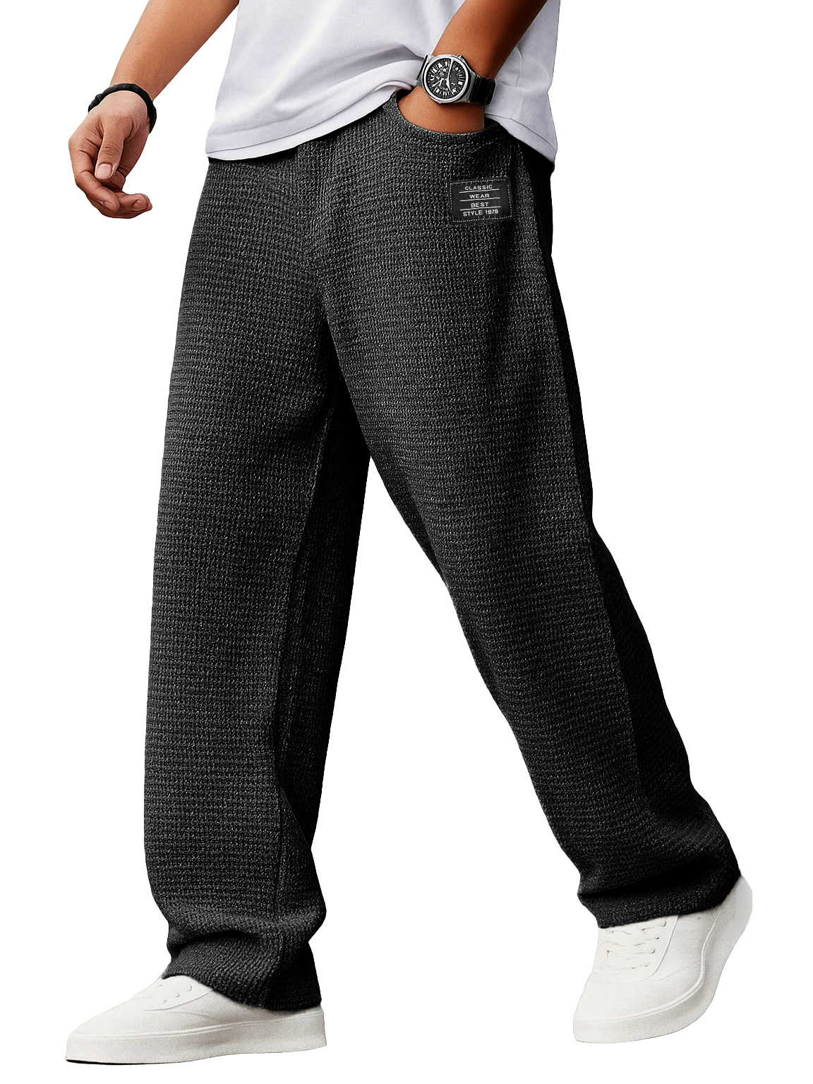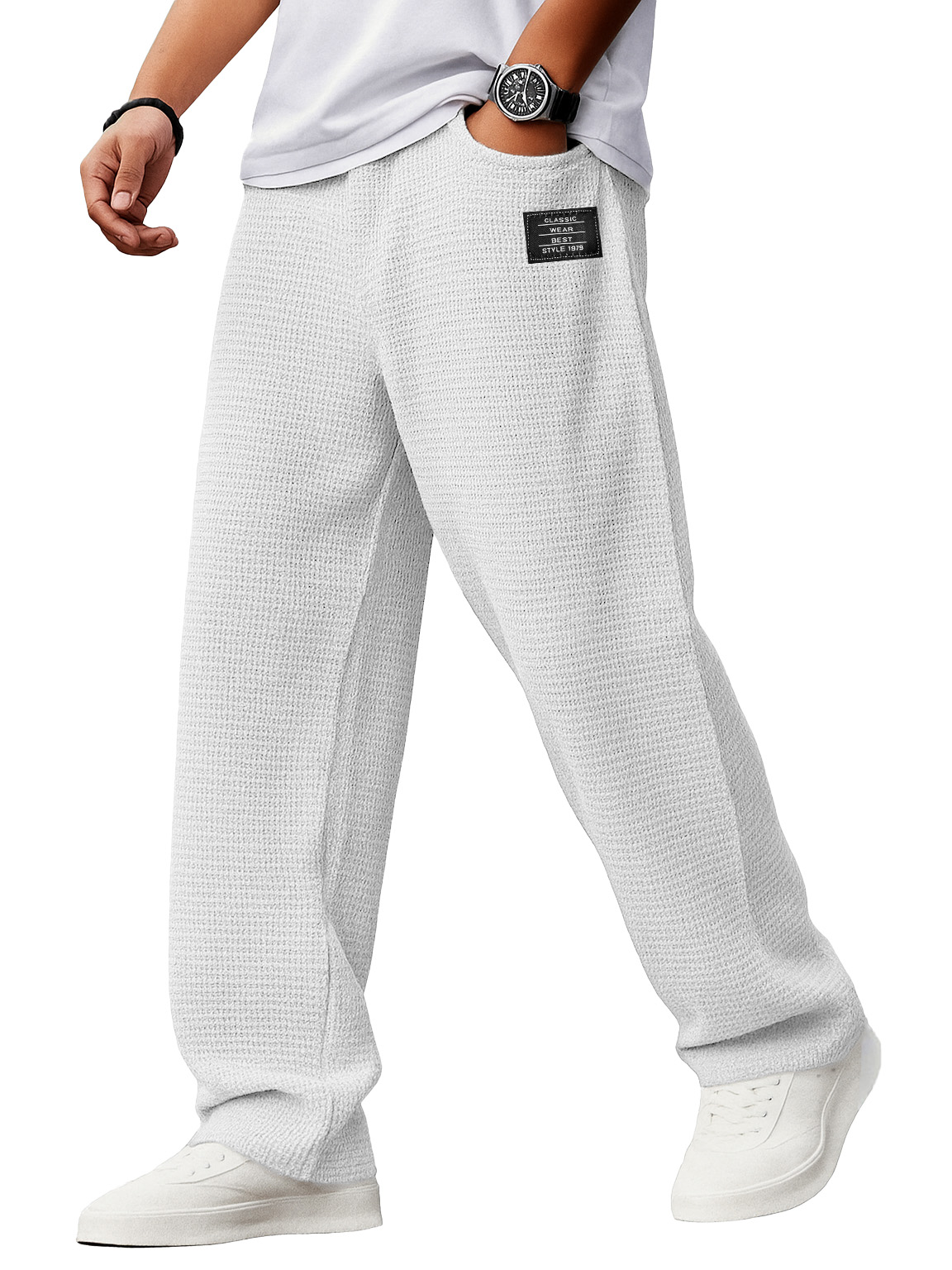 Men's Stylish Everyday Waffle Fabric Pants With Loose-fitting Drawstring Waist And Embroidered Logo