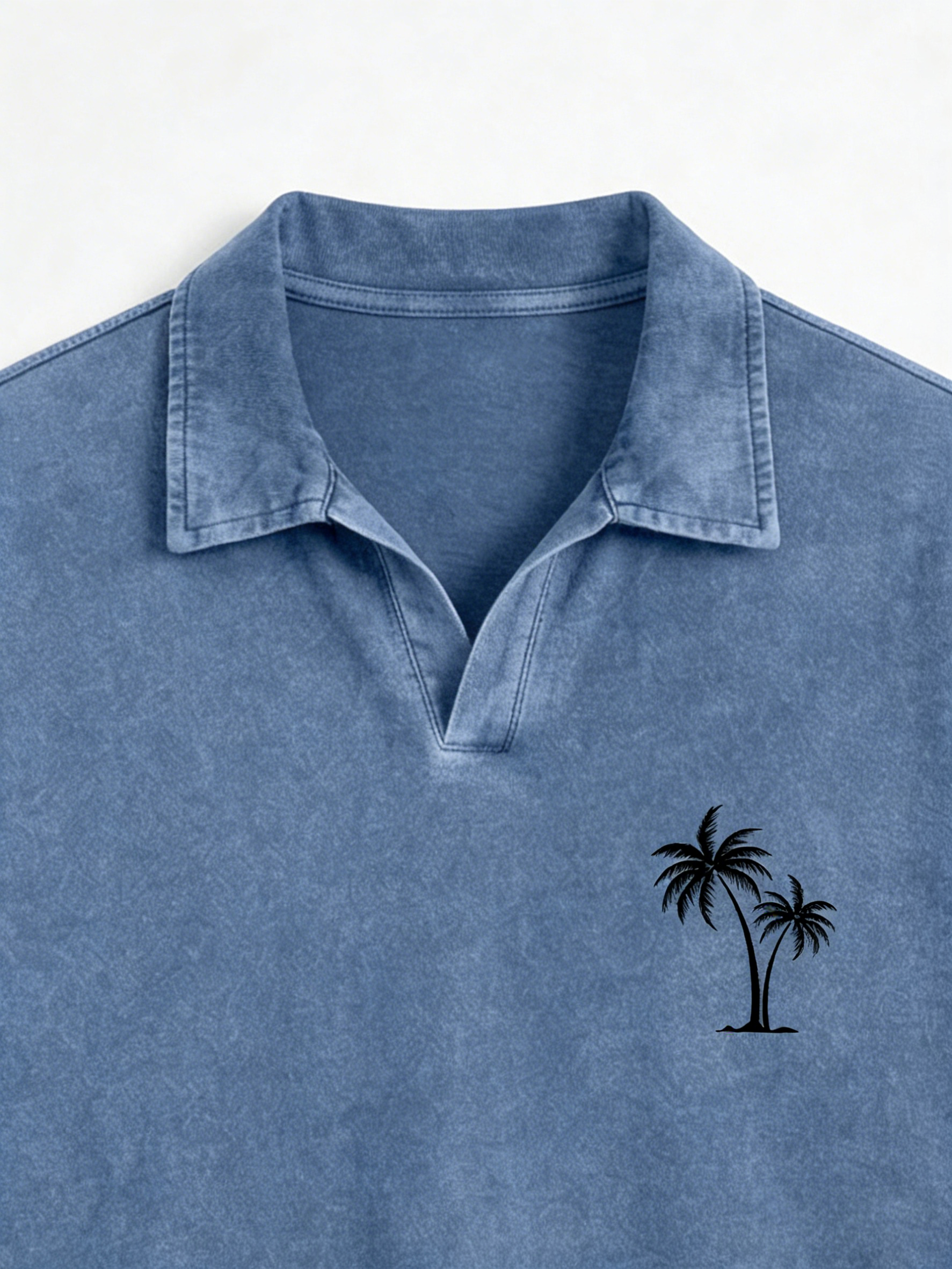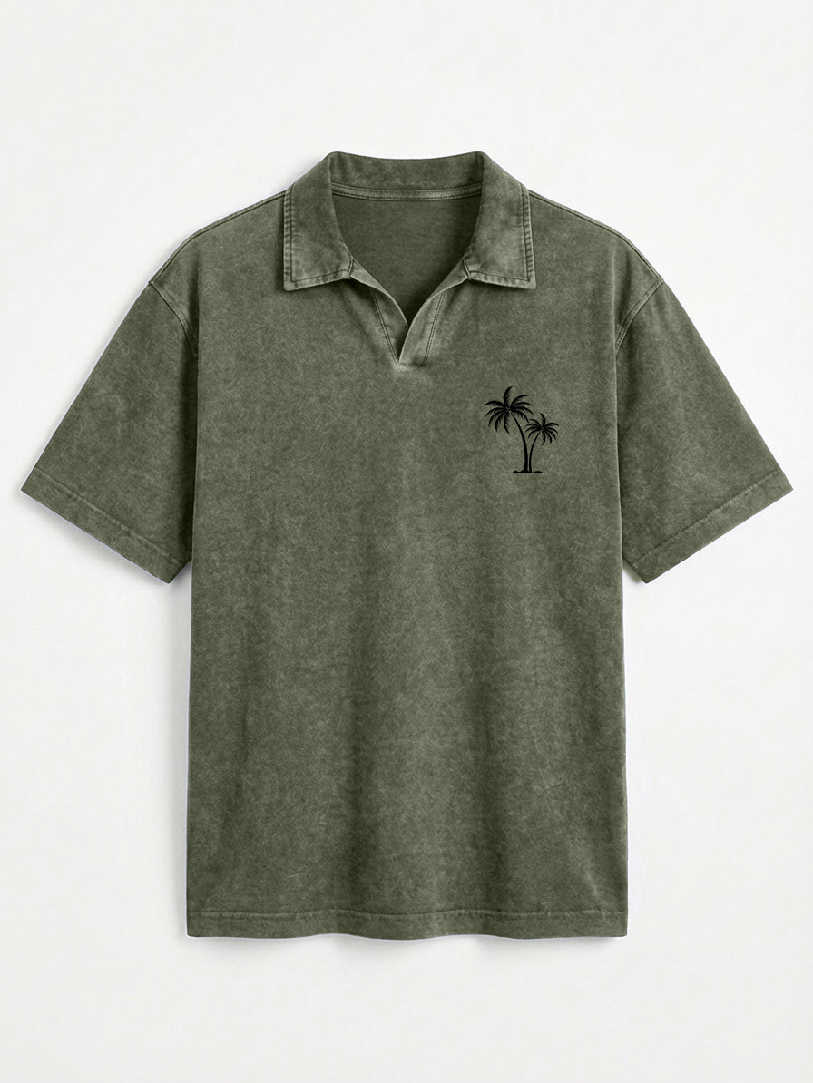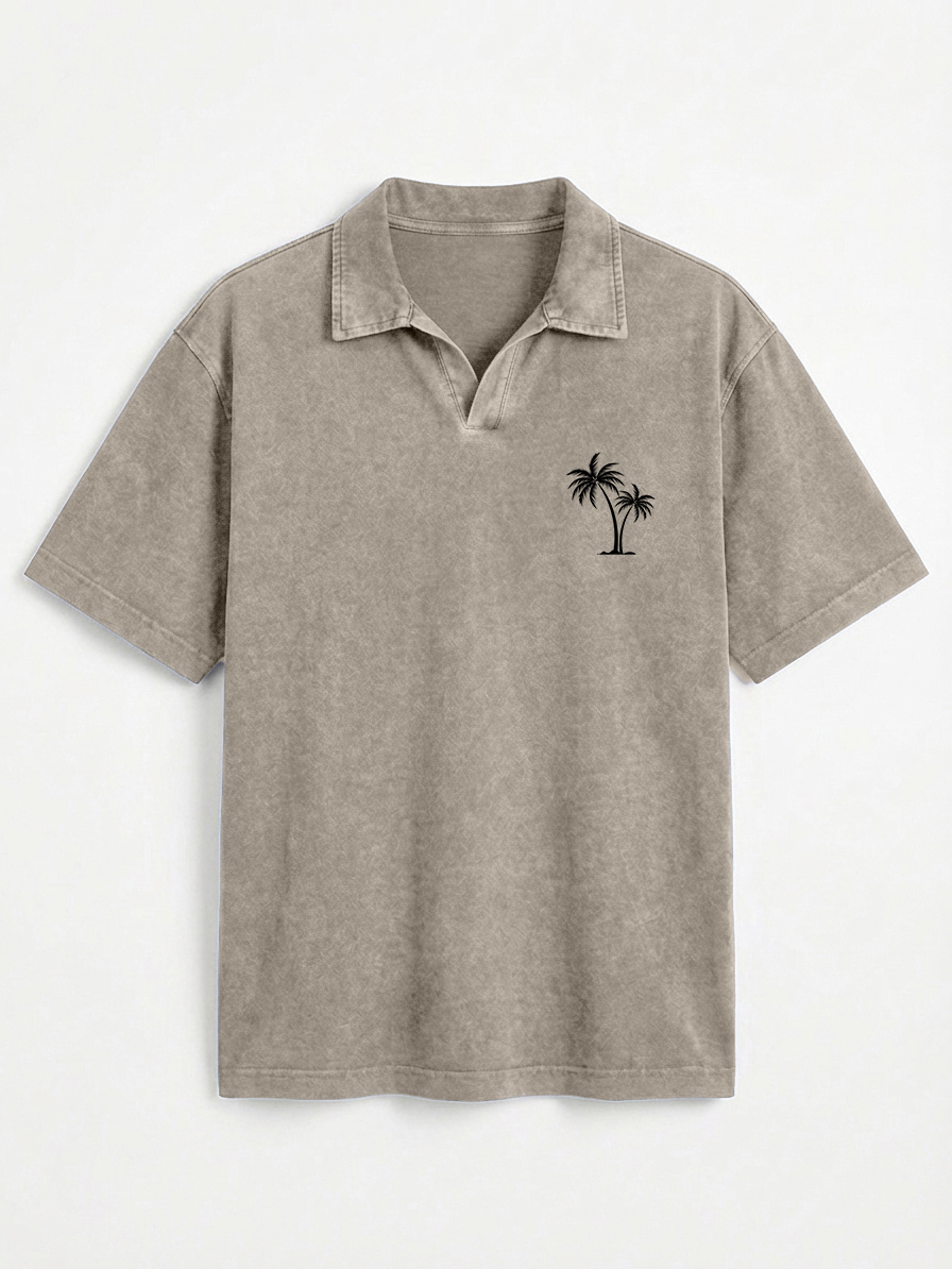 Men's Vintage Distressed Palm Tree Print Seagull Collar Short-Sleeve Polo Shirt