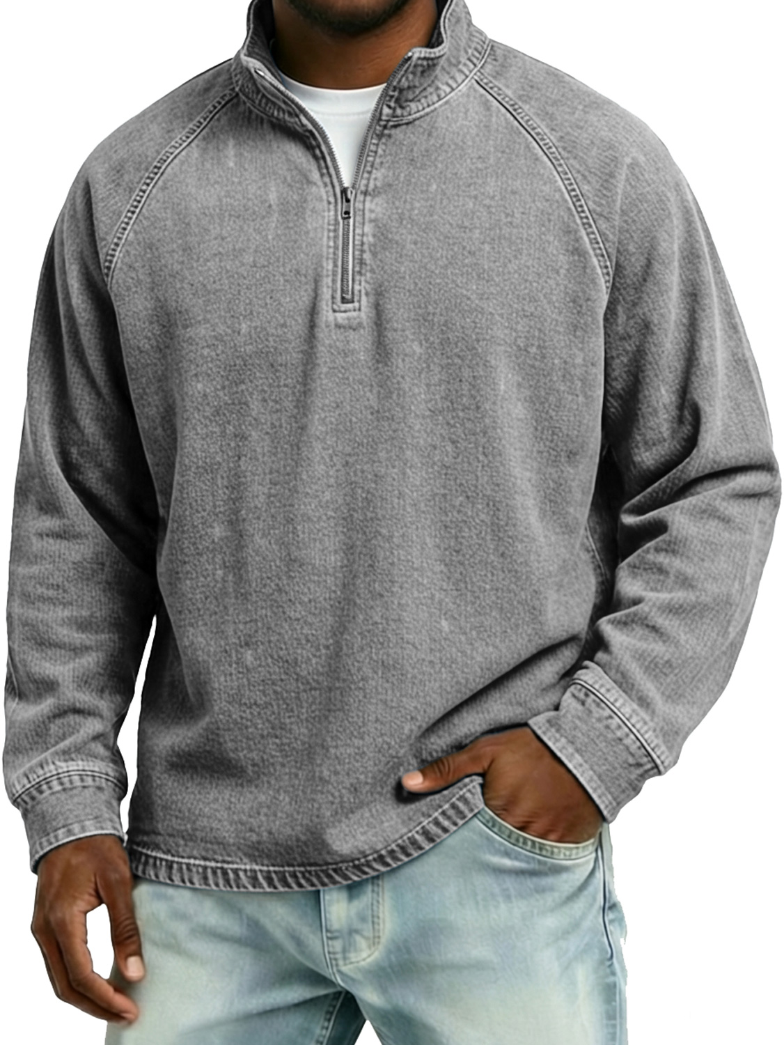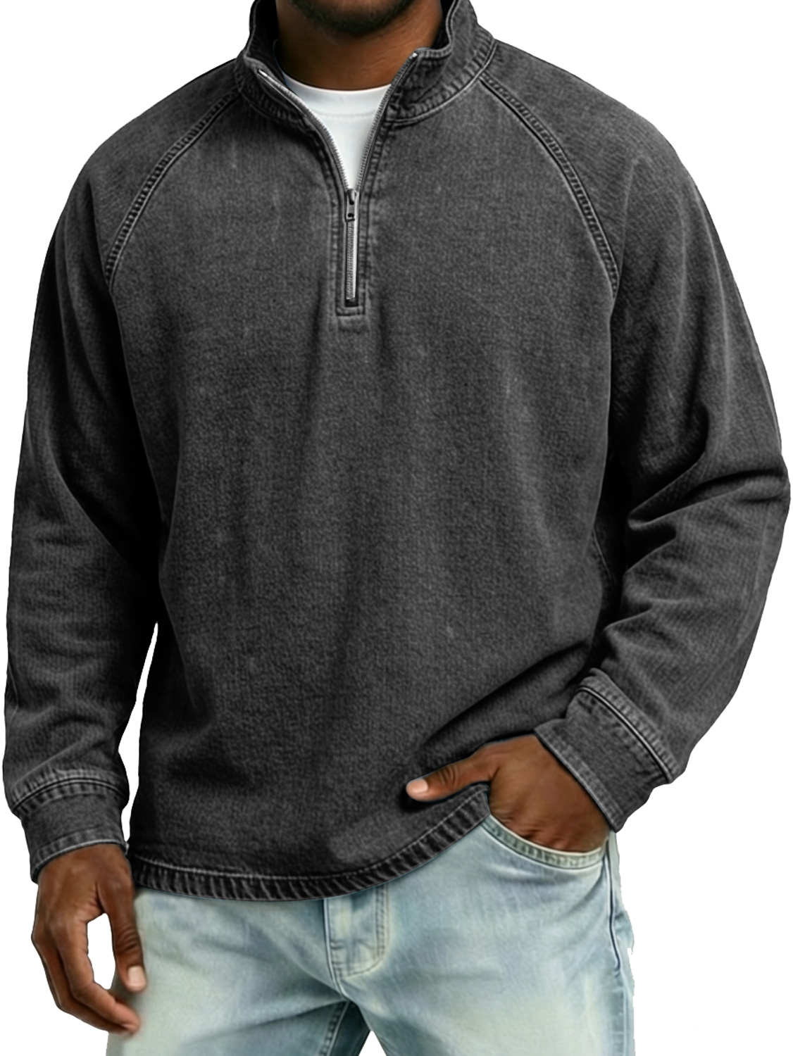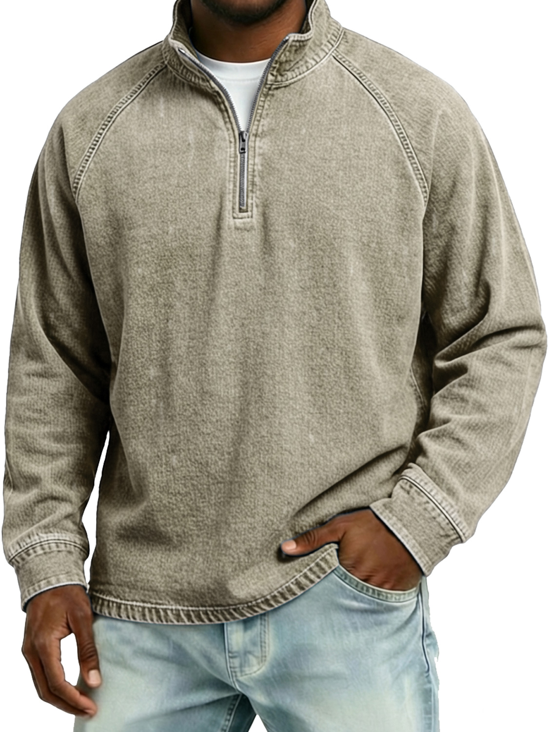 Men's Vintage Raglan Sleeve Stand-collar Zip-up Casual Long-sleeved T-shirt