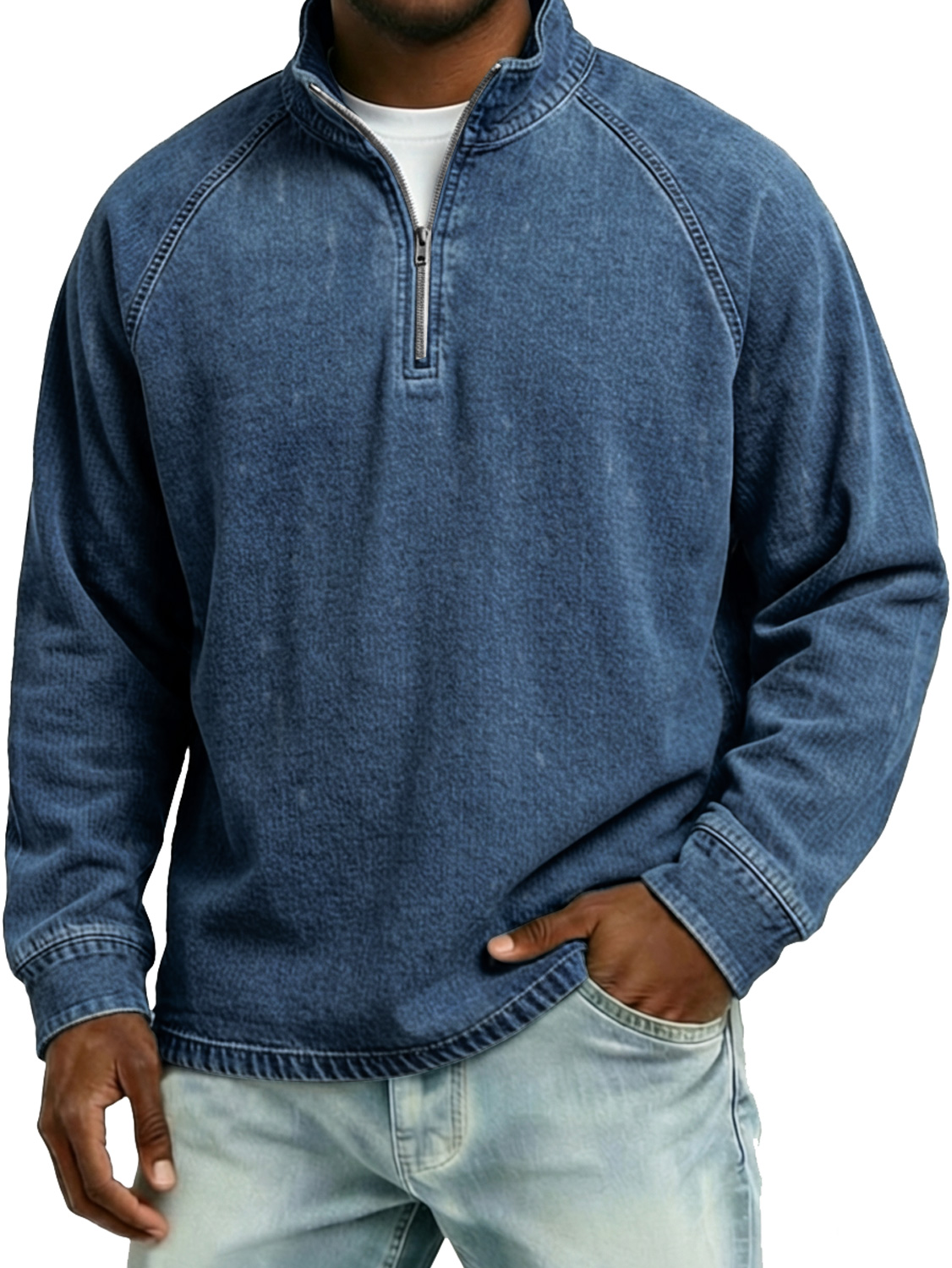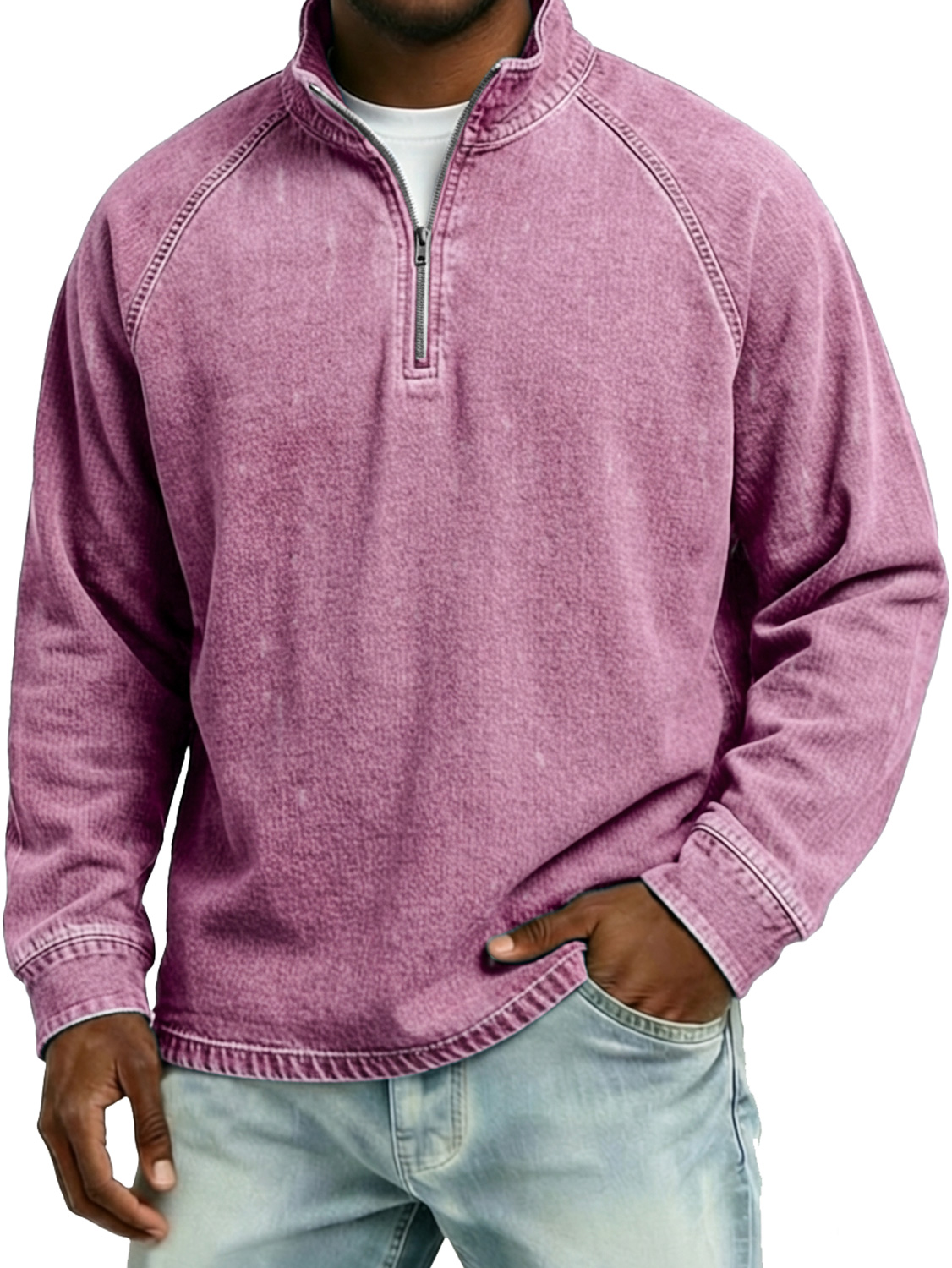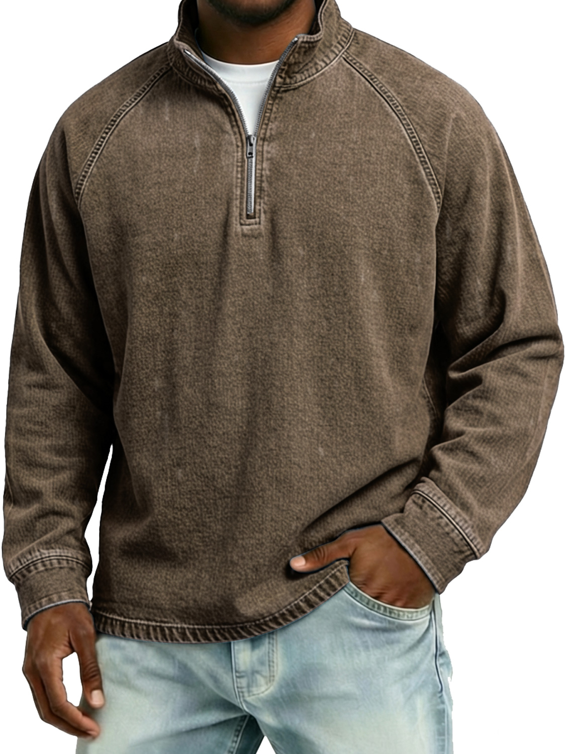 Men's Vintage Raglan Sleeve Stand-collar Zip-up Casual Long-sleeved T-shirt