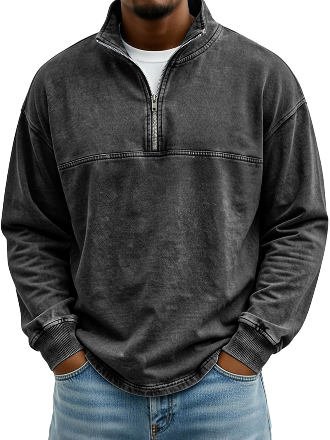 Men's Vintage Stand-collar Long-sleeved T-shirt With Zipper And Contrasting Stitching Design