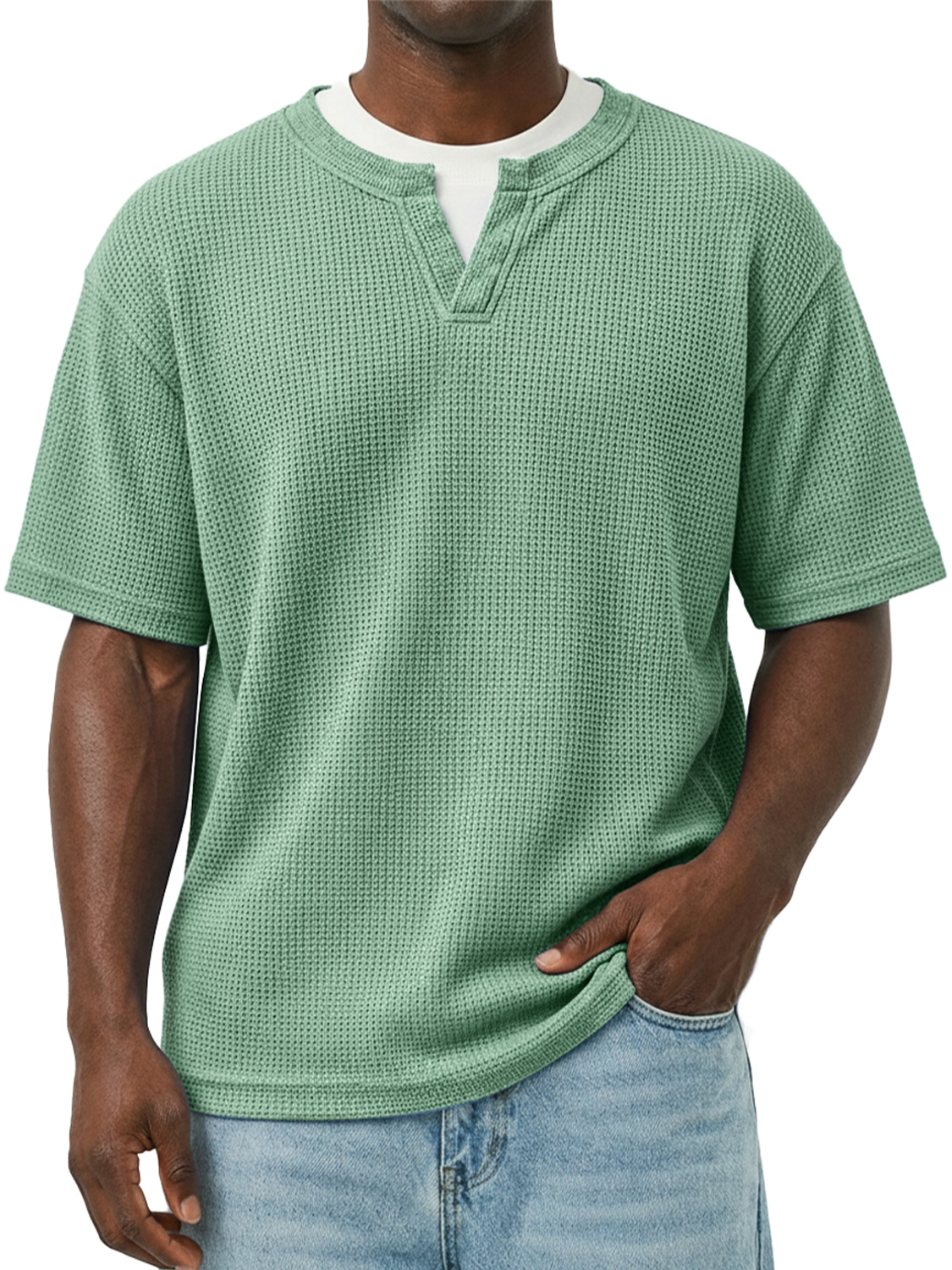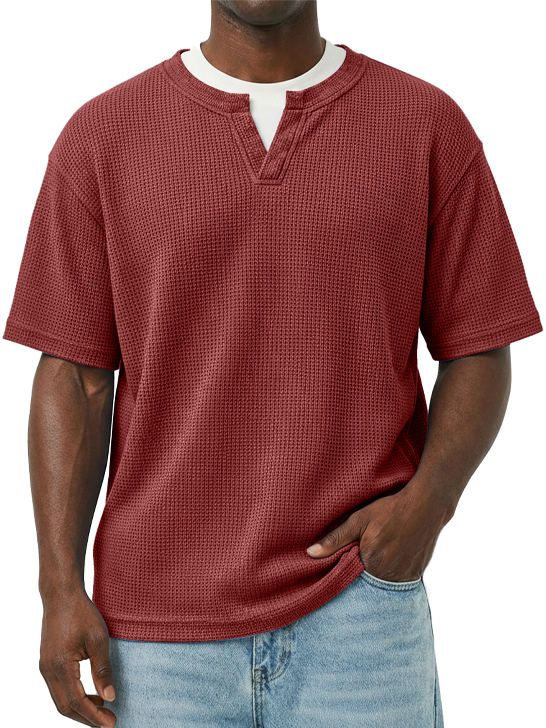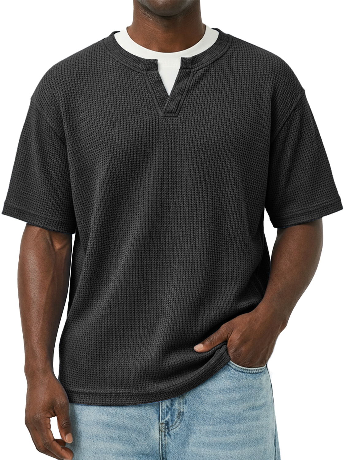 Men's Waffle-knit Double-layered Collar Faux Two-piece Casual Long-sleeved T-shirt