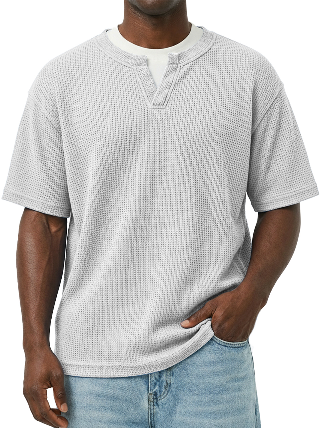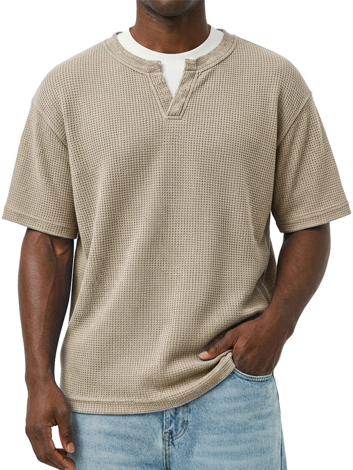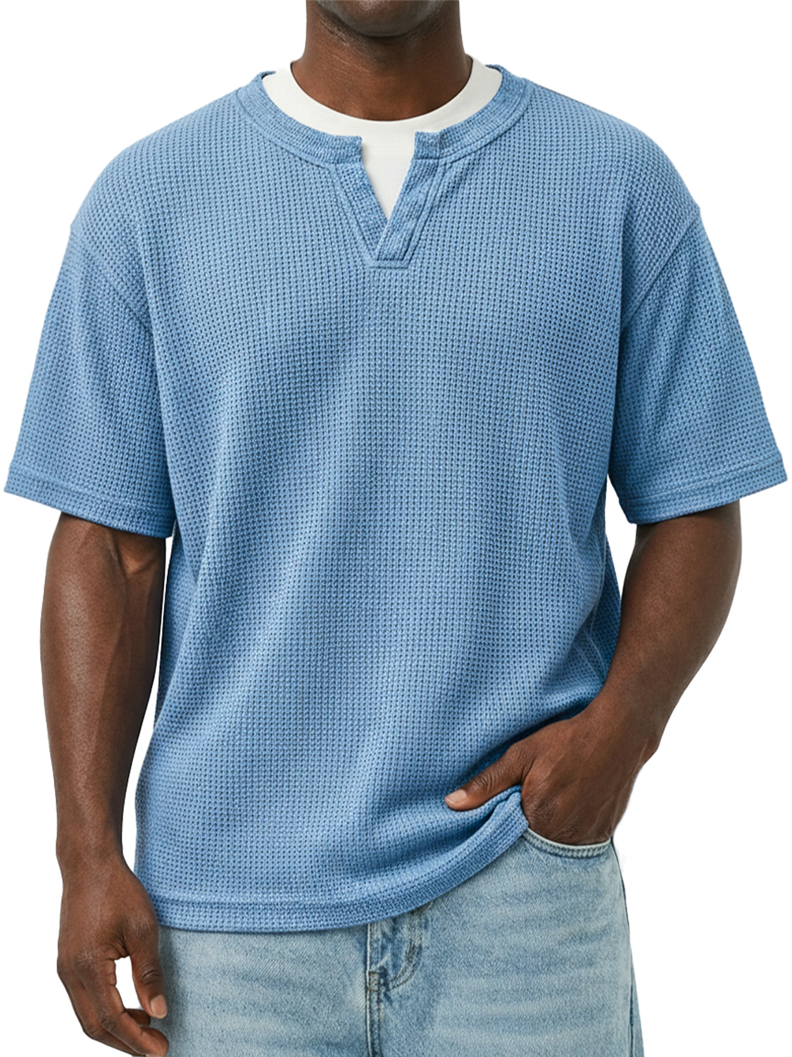 Men's Waffle-knit Double-layered Collar Faux Two-piece Casual Long-sleeved T-shirt