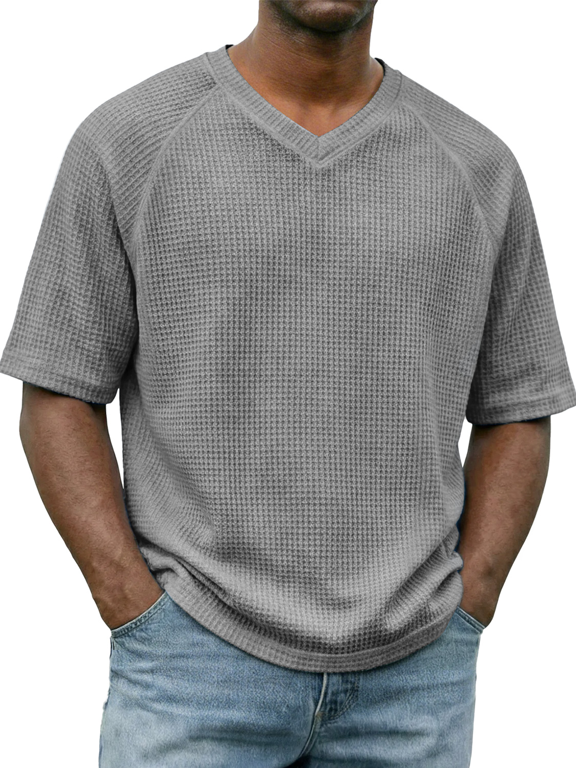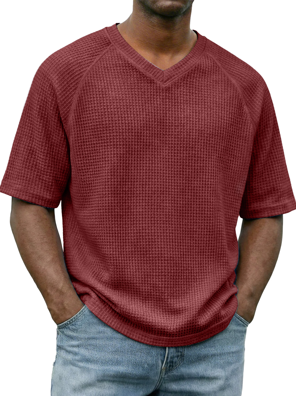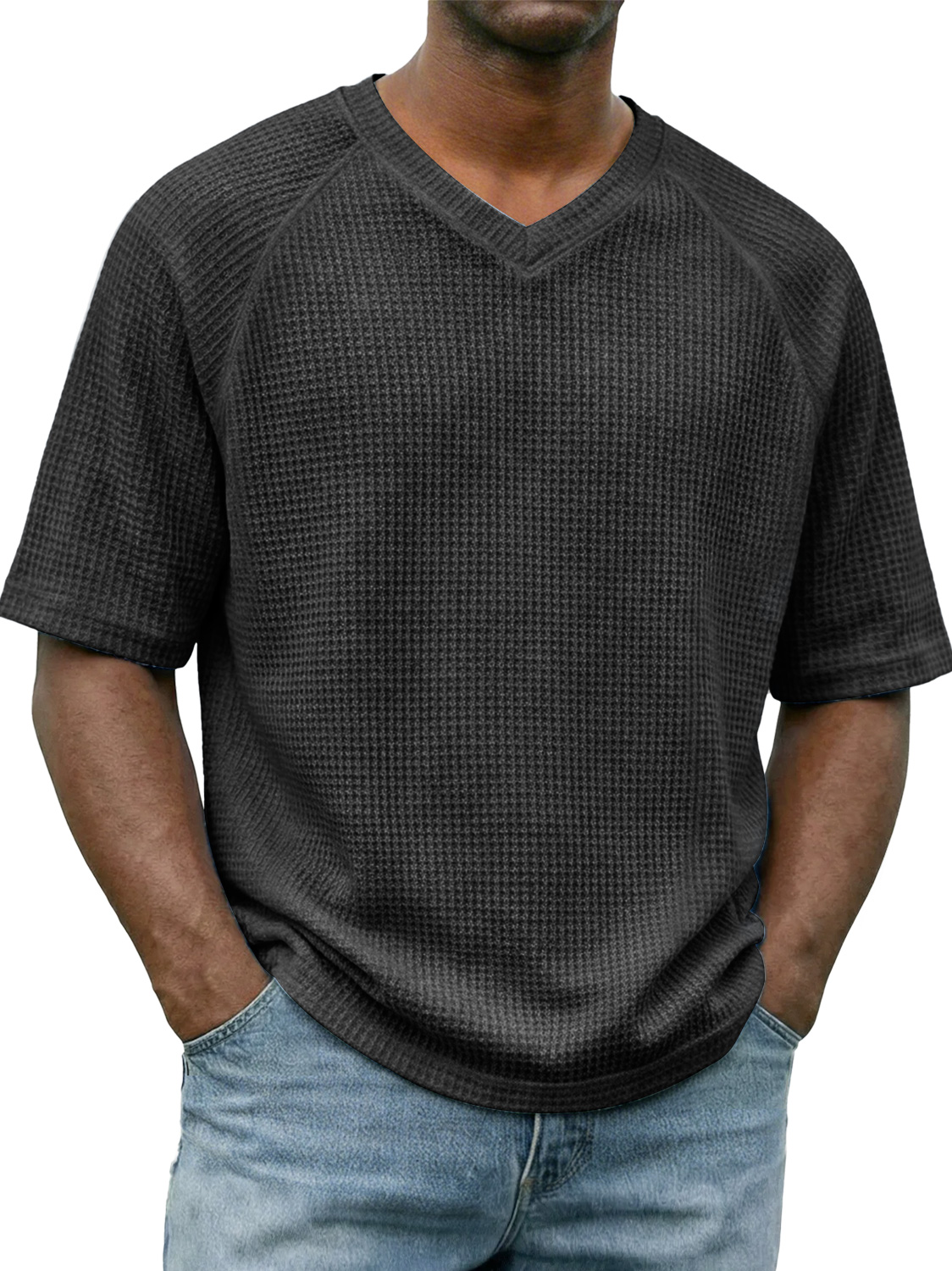 Men's Waffle-knit V-neck Raglan Sleeve Casual Solid Color Short-sleeved Shirt