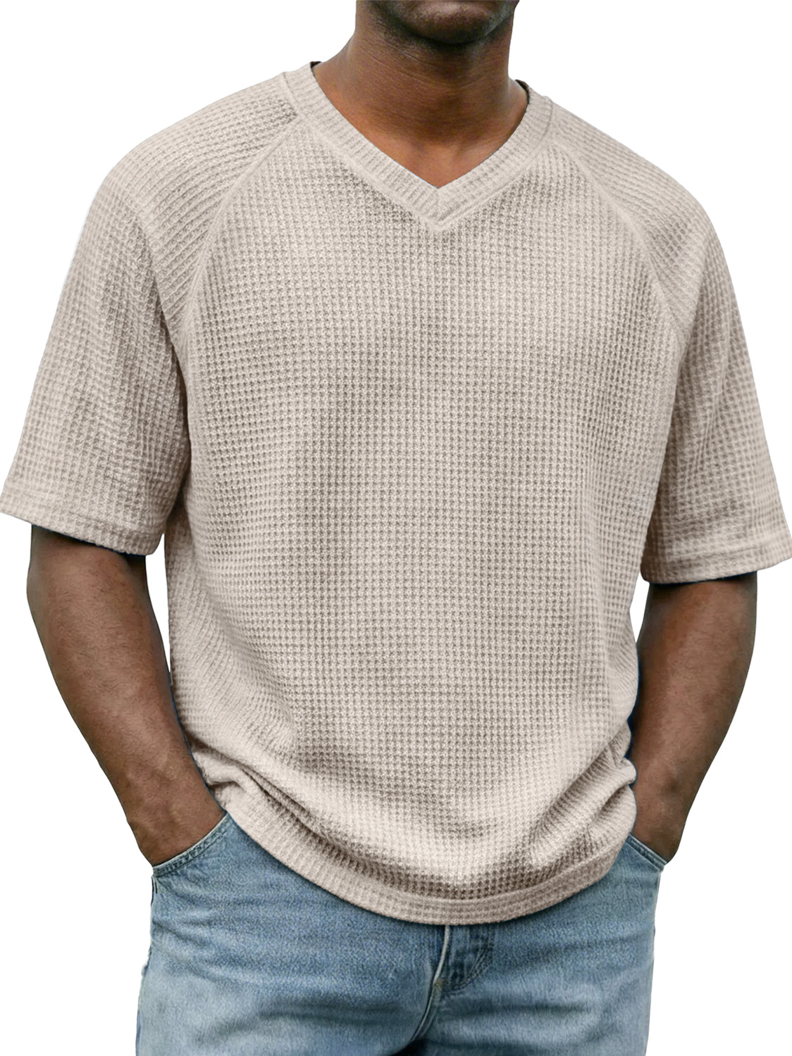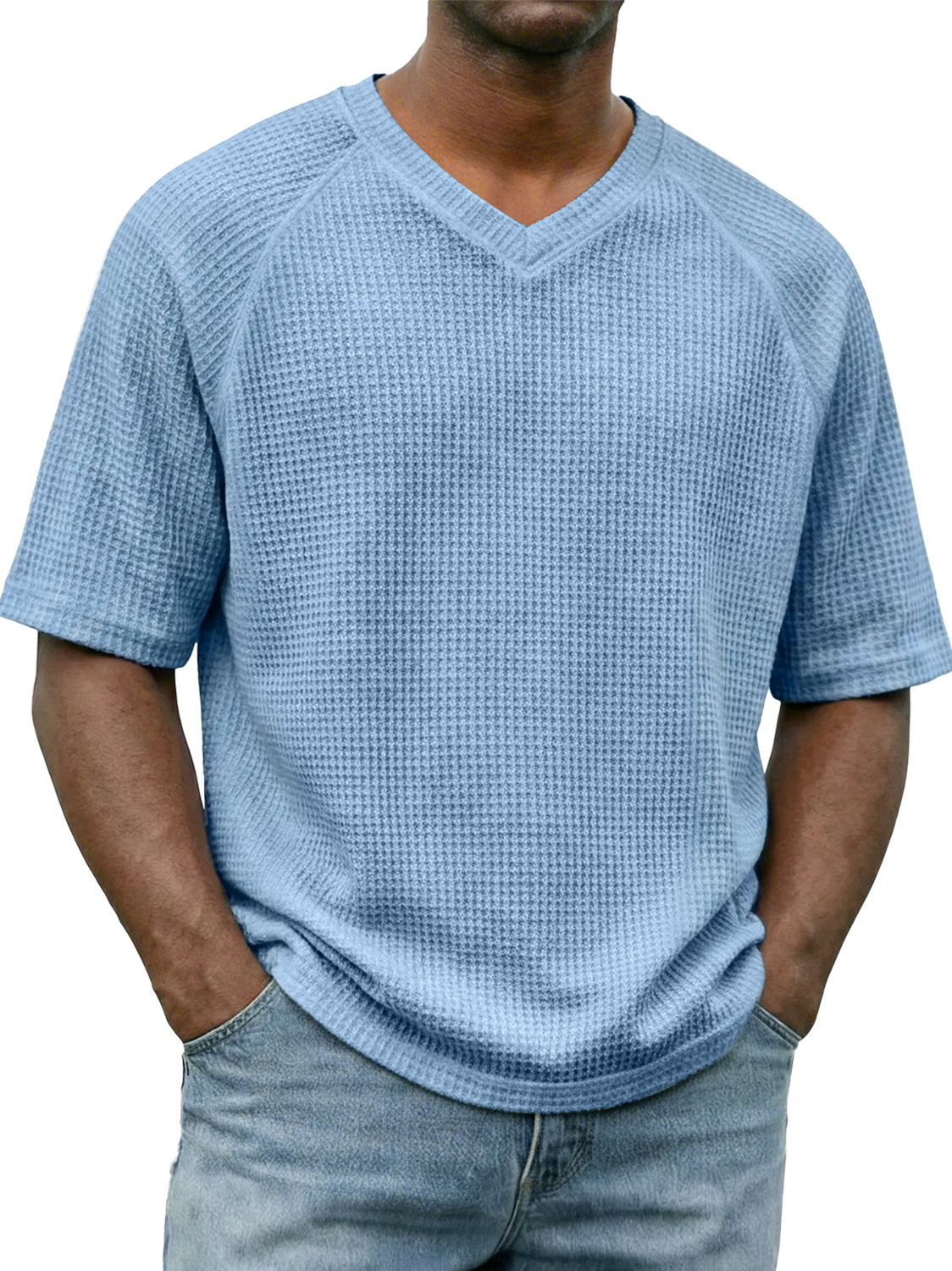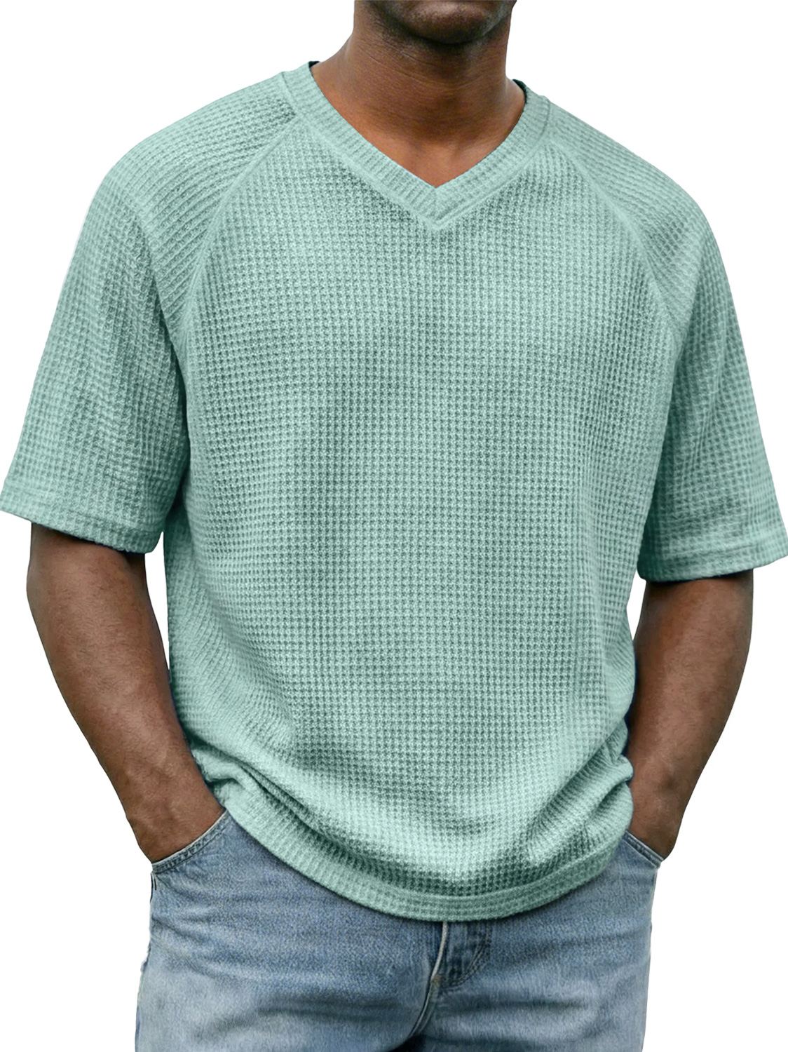 Men's Waffle-knit V-neck Raglan Sleeve Casual Solid Color Short-sleeved Shirt