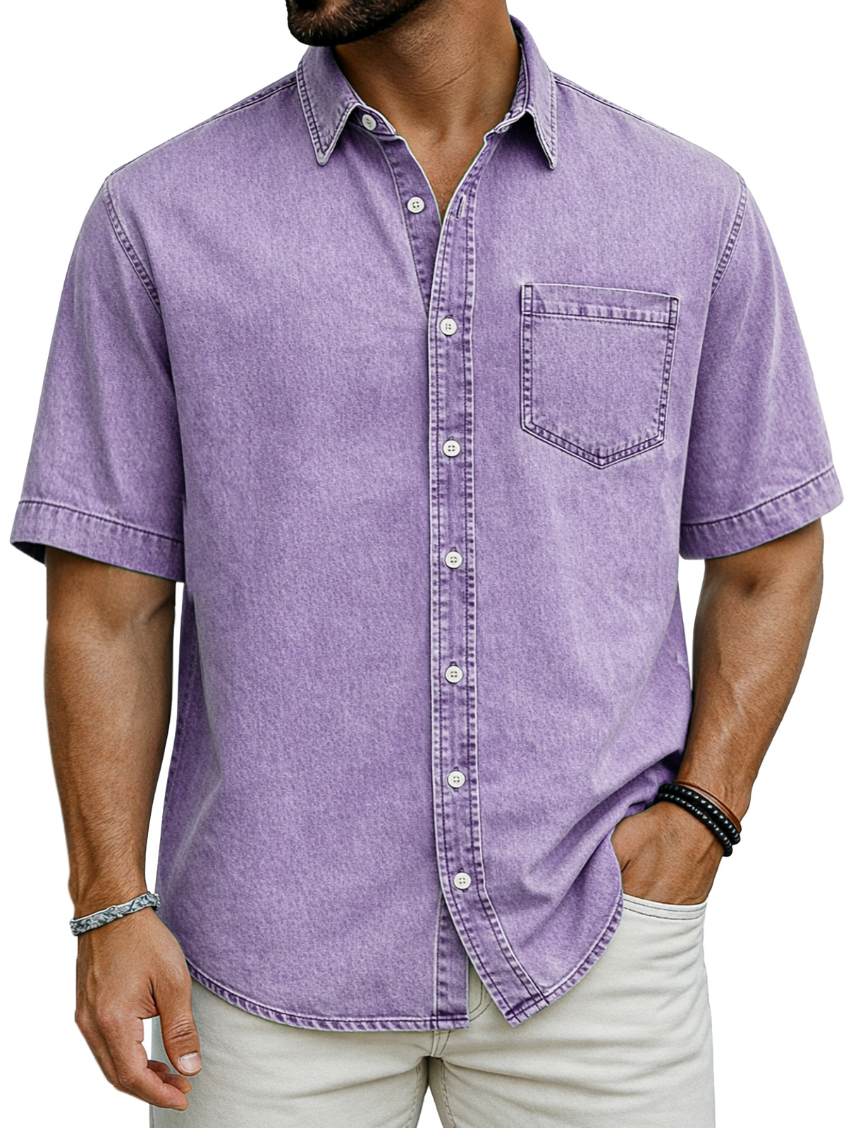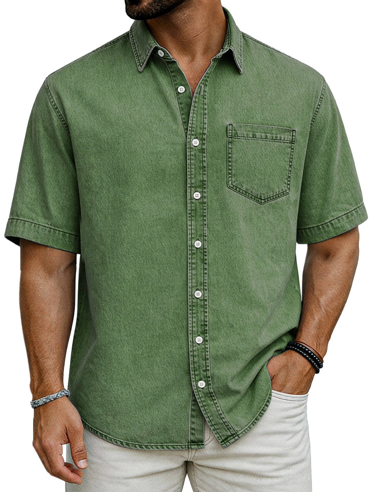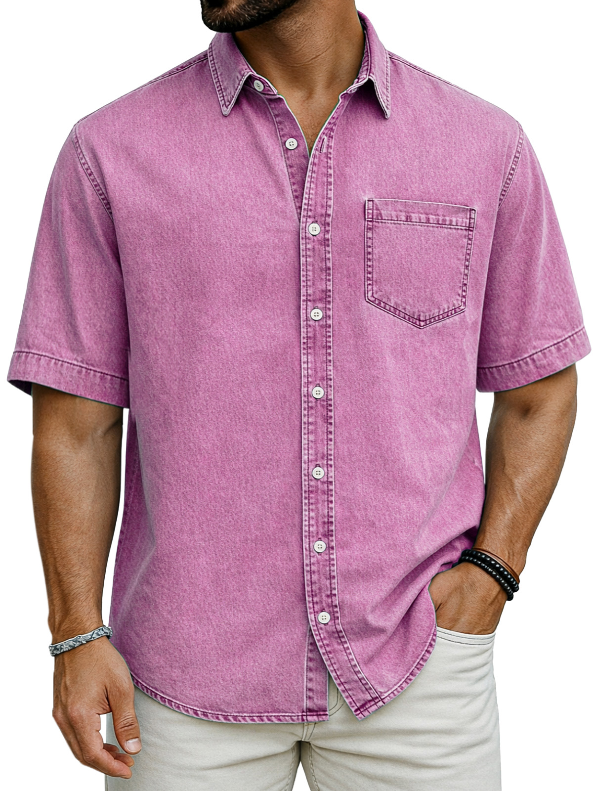 Retro Simple Solid Color Short-Sleeve Shirt with Chest Pocket