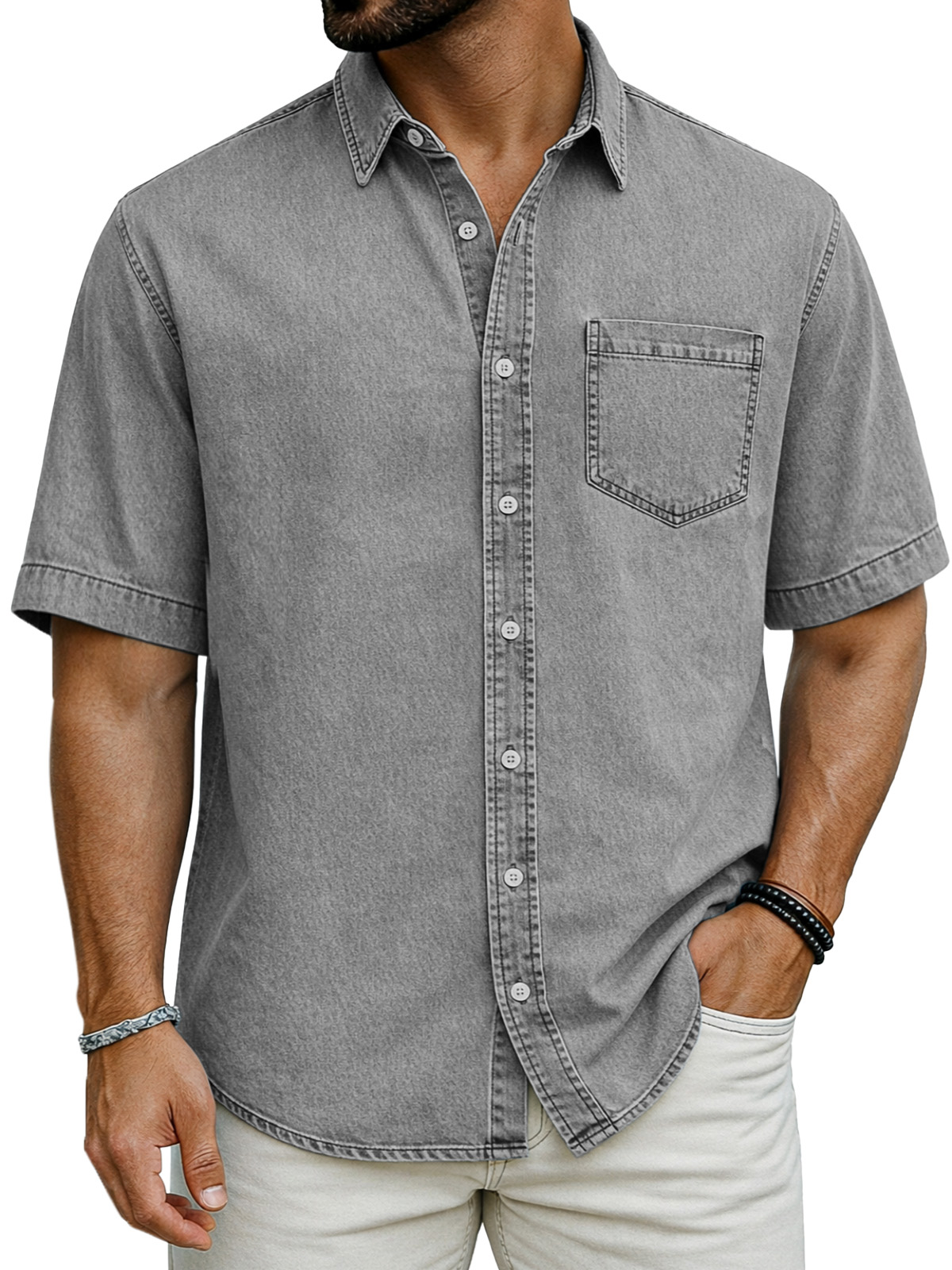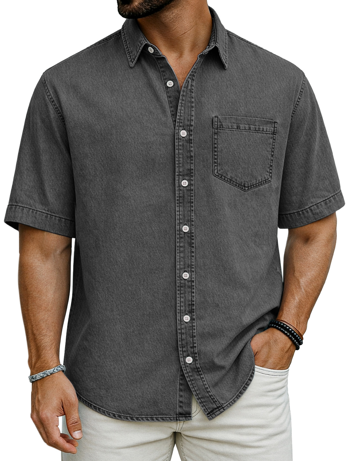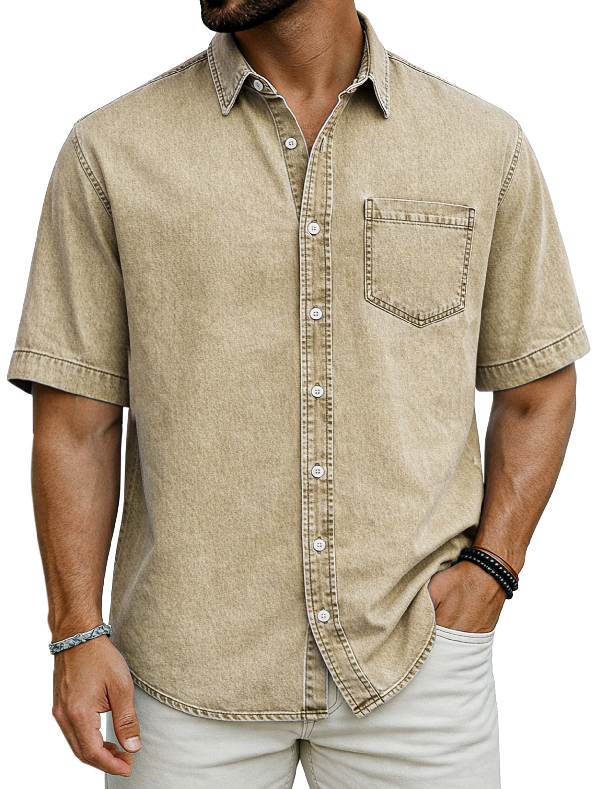 Retro Simple Solid Color Short-Sleeve Shirt with Chest Pocket