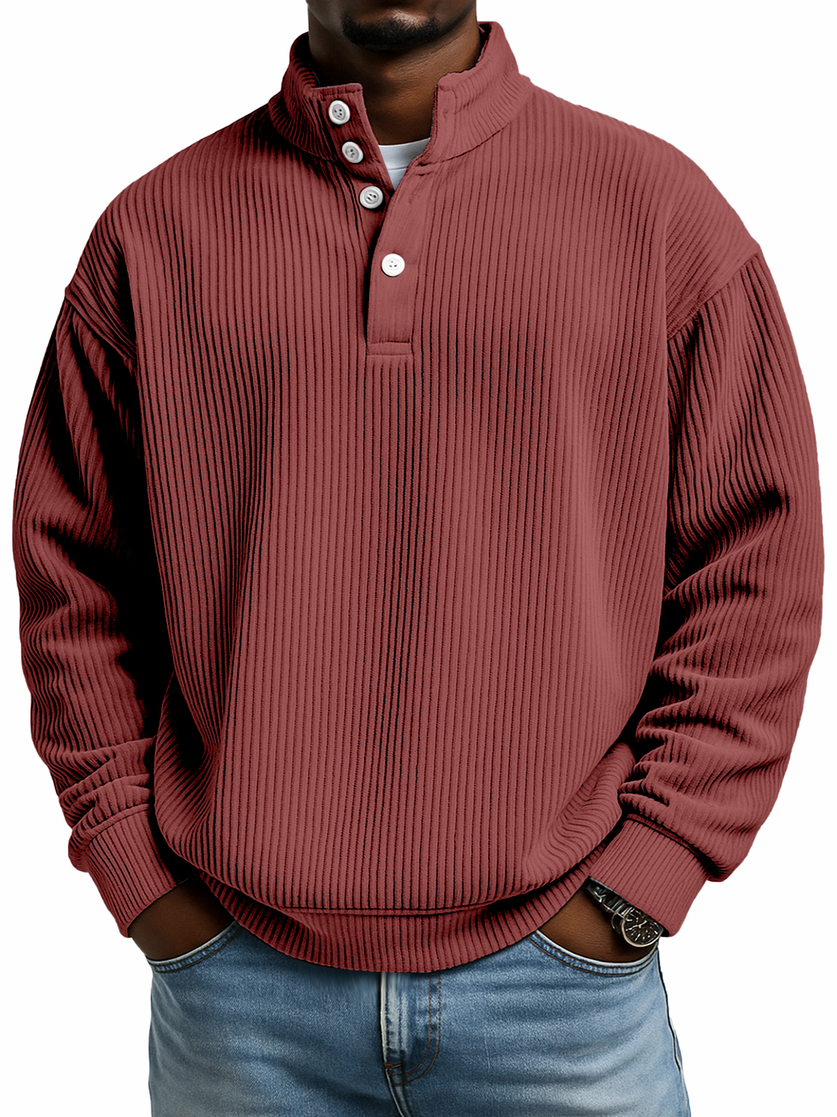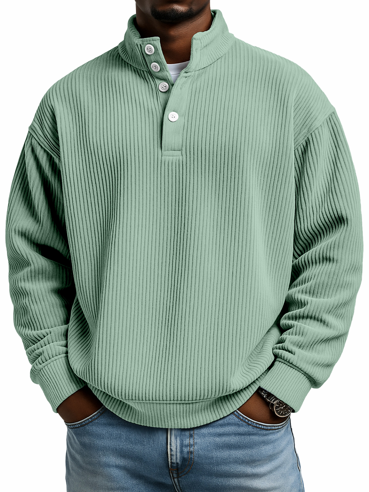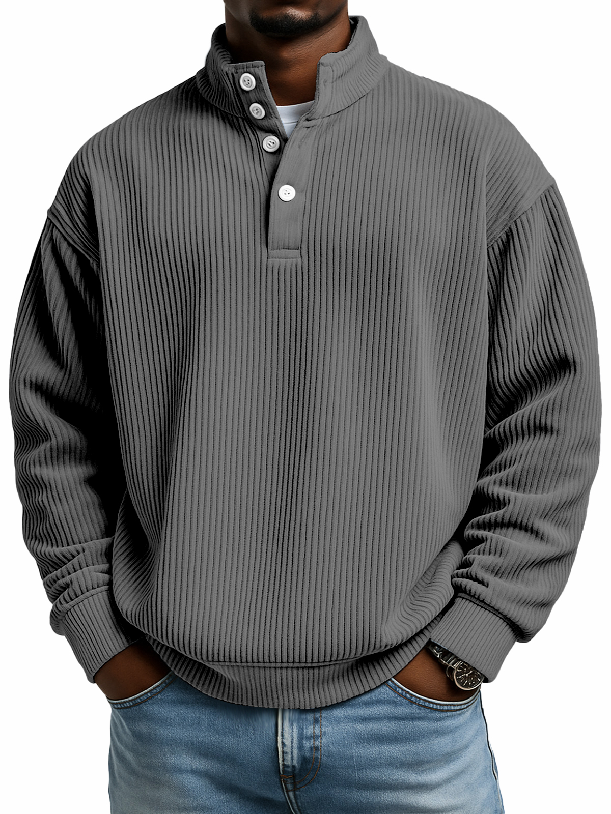 Simple casual solid color vertical ribbed texture four-button stand collar long sleeve sweatshirt