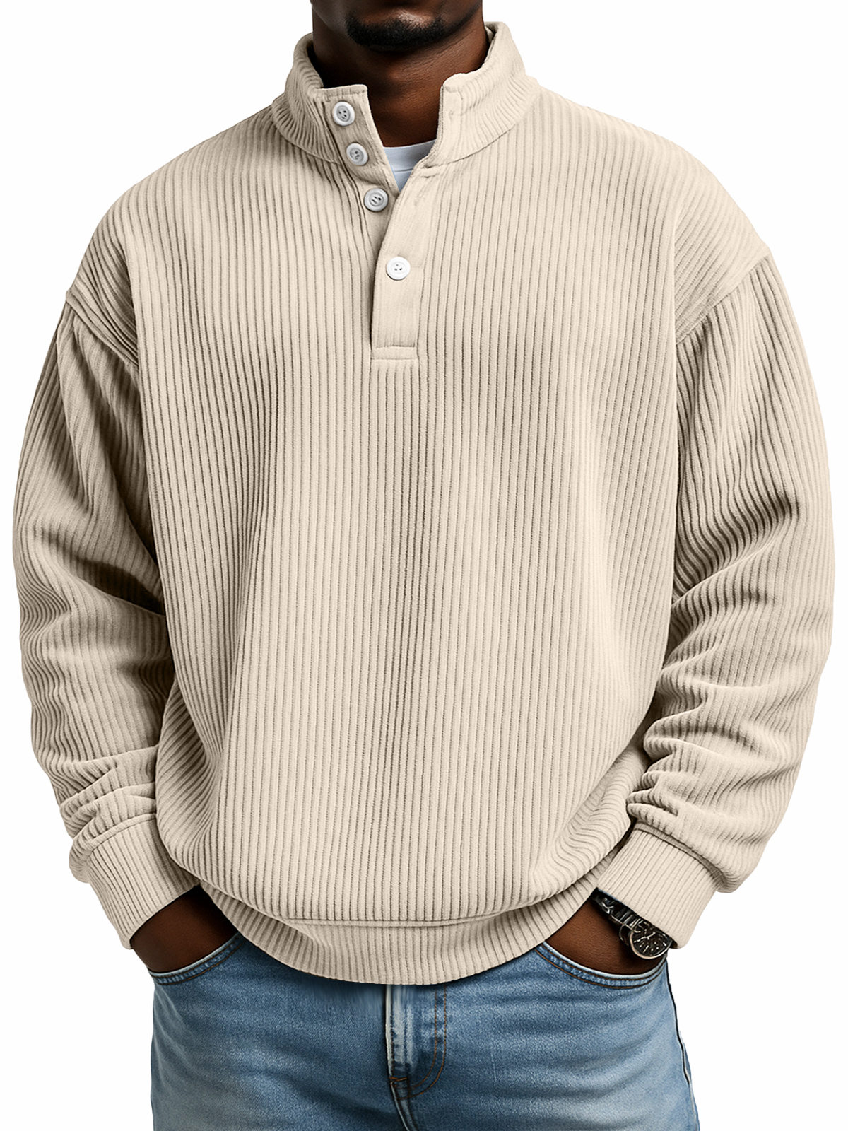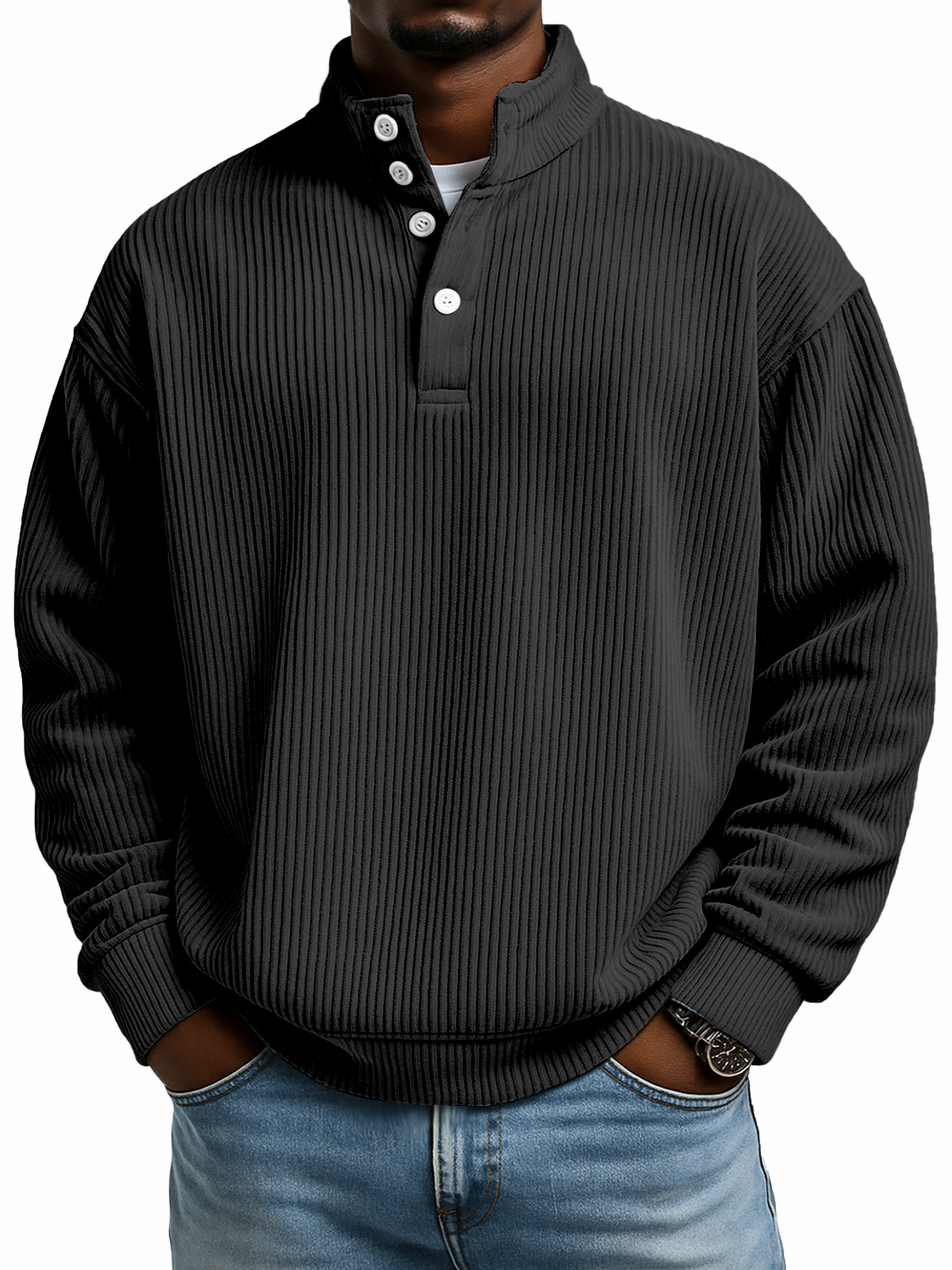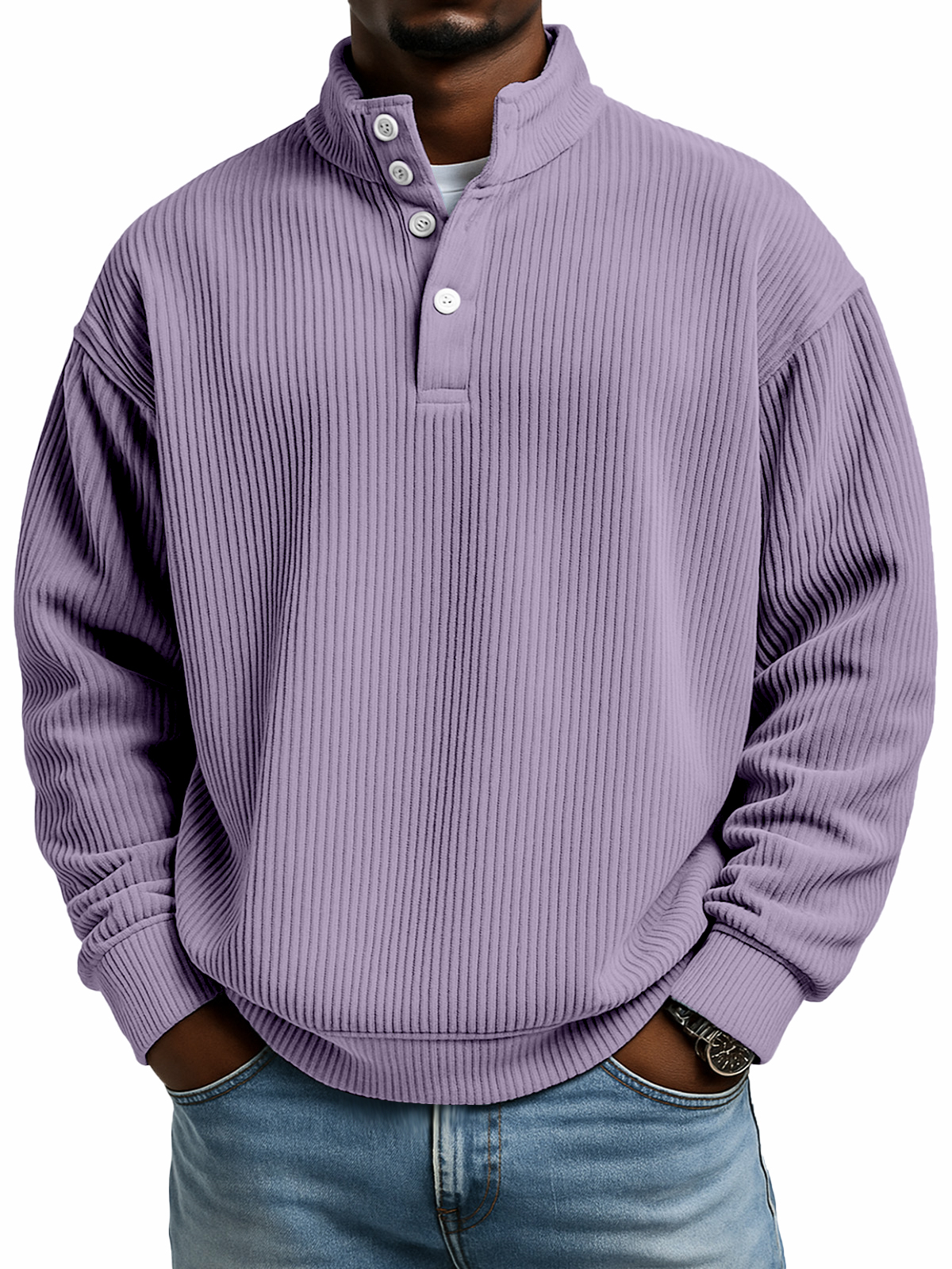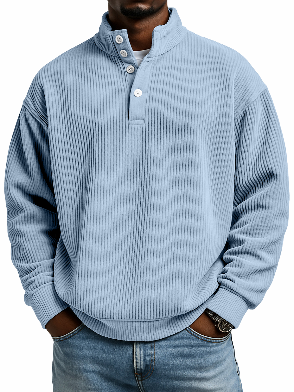 Simple casual solid color vertical ribbed texture four-button stand collar long sleeve sweatshirt