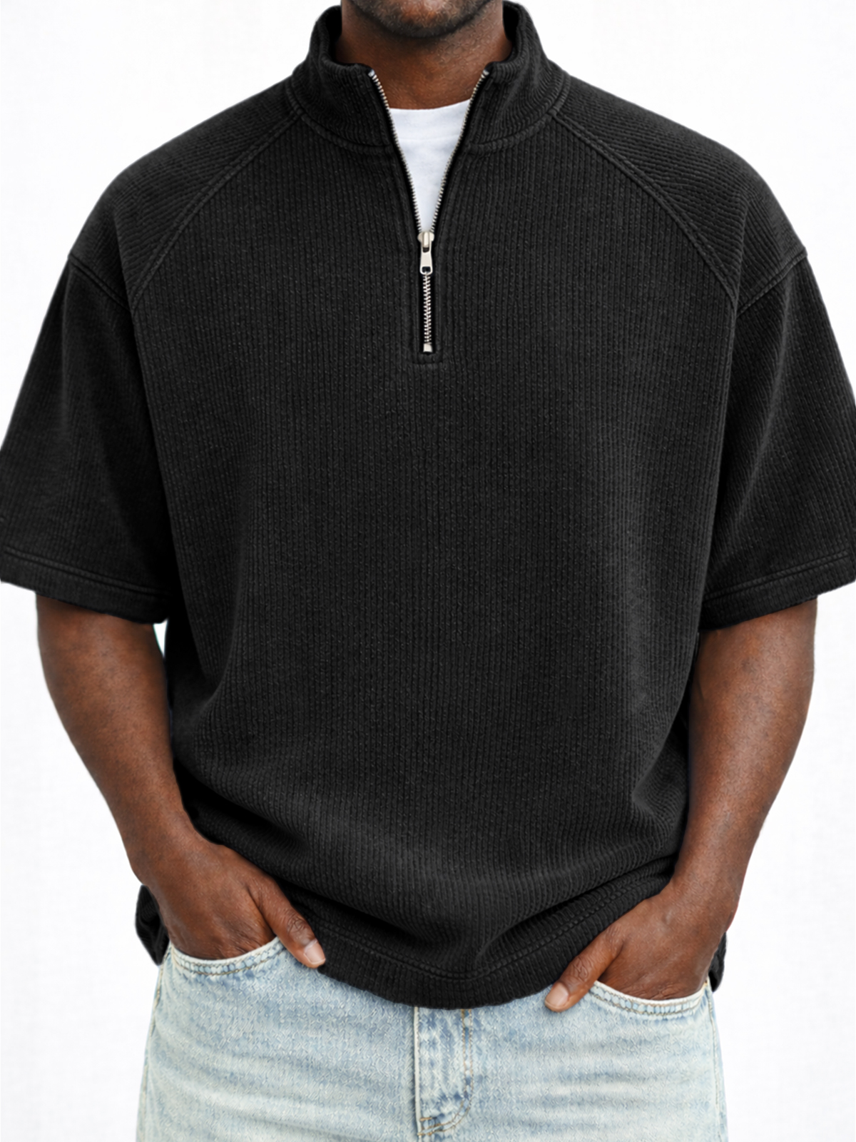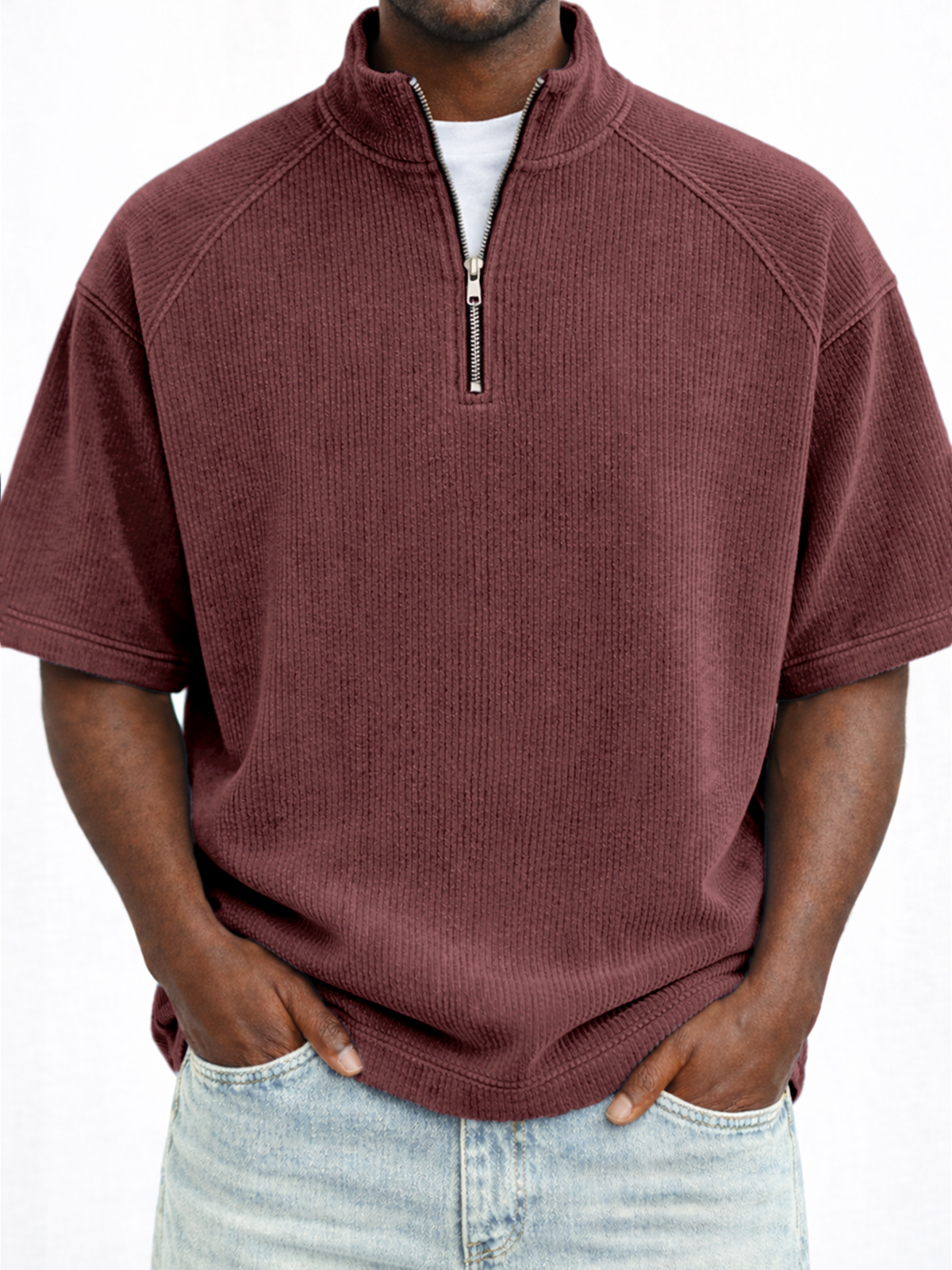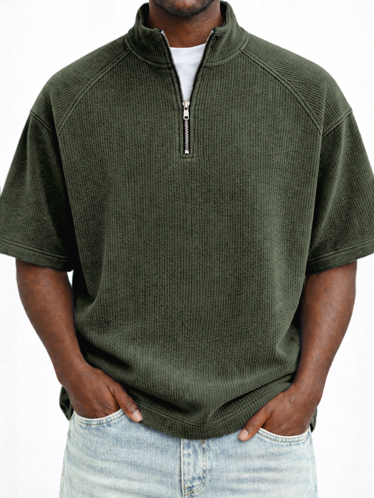 Vertical Striped Ribbed Half-zip Pullover Raglan Top